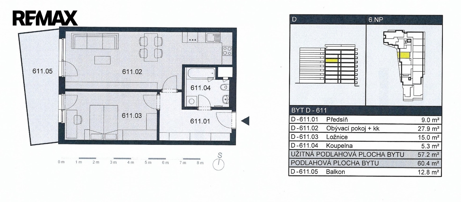 Byt je situován v 6. nadzemním podlaží domu s výtahem a díky své západní orientaci je krásně prosvětlený a zároveň poskytuje dostatek klidu i přes výbornou dostupnost do centra města. Celková podlahová plocha činí 60,4 m² (užitná plocha bytu 57,2 m²) a součástí je prostorný balkon o velikosti 12,8 m².