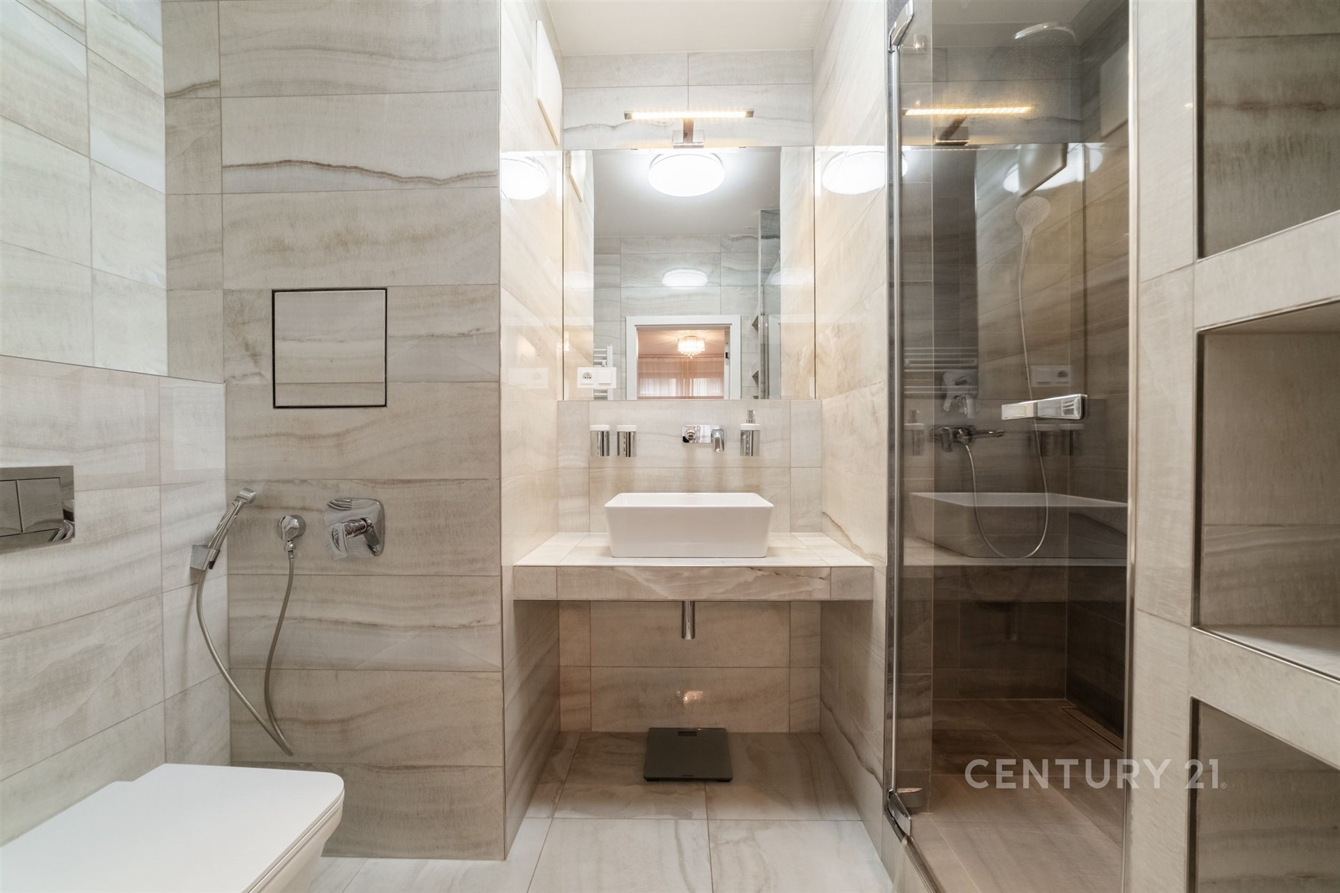 Velkou výhodou dispozice jsou dvě toalety. Jedna větší koupelna se sprchovým koutem je přístupná přímo z ložnice a nabízí maximální komfort a soukromí, druhá samostatná toaleta slouží jako hostovská a je prakticky umístěna v zádveří bytu. Celkově je interiér navržen tak, aby poskytoval pohodlné a funkční bydlení s důrazem na každodenní komfort.