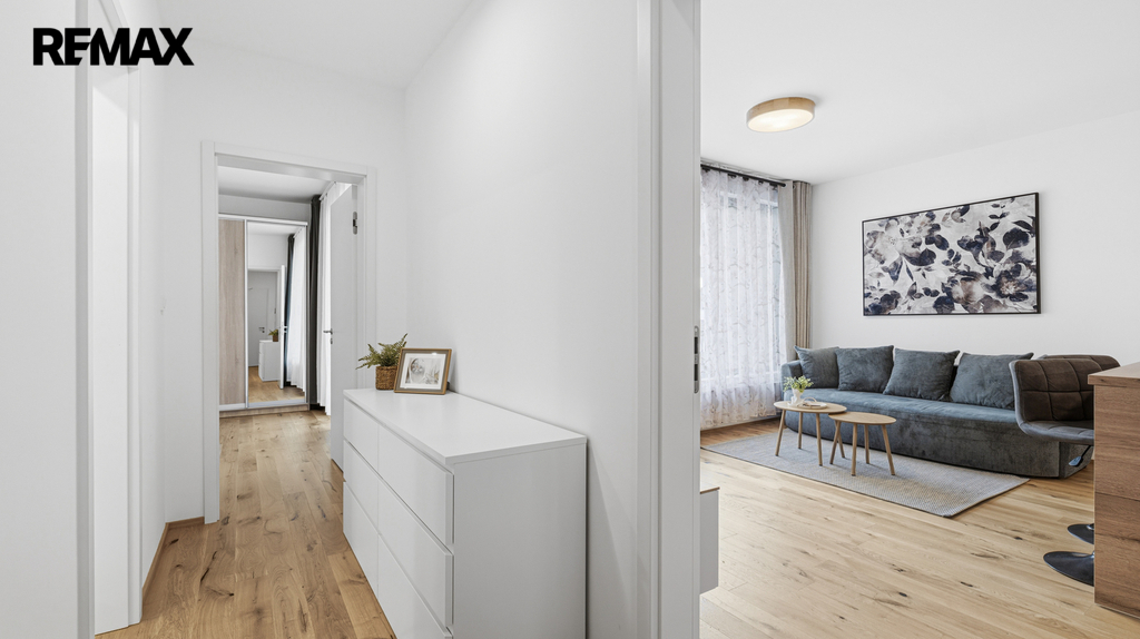 Dispozičně byt nabízí obývací pokoj s kuchyňským koutem a moderním ostrůvkem s barovými židlemi, kuchyňskou linku včetně spotřebičů, ložnici s postelí, matrací a šatní skříní, plně vybavenou předsíň a koupelnu s vanou, umyvadlem a toaletou. Interiér je kompletně zařízený, včetně sedačky, konferenčního stolku, TV stolku, dekorací a záclon i závěsů v obou místnostech. K dispozici je také praktická komora a součástí pronájmu je garážové stání v domě.