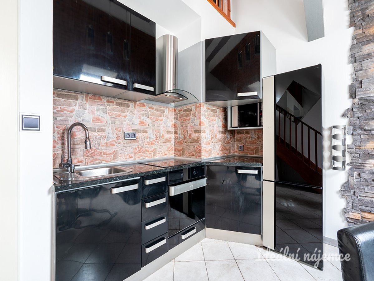 K dlouhodobému podnájmu nabízíme krásný klimatizovaný plně vybavený mezonetový byt o dispozici 2+kk v oblíbené lokalitě Nové Město. Byt o celkové výměře 55 m2 se nachází v posledním podlaží cihlového domu s výtahem, díky tomu Vás čeká ničím nerušený klid. K bytu patří i sklep.