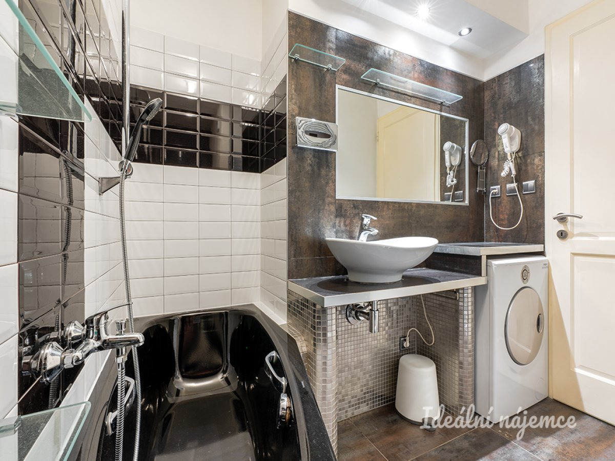 Byt se nabízí plně vybavený. Elegantní kuchyně disponuje lednicí, elektrickou troubou, varnou deskou, mikrovlnnou troubou a digestoří. Obývací část je zařízena pohovkou, konferenčním stolem a televizí. Součástí ložnice je postel, šatna, šatní skříň a z druhé strany šatní skříně najdeme pracovní stůl. V koupelně je vana, pračka a toaleta.