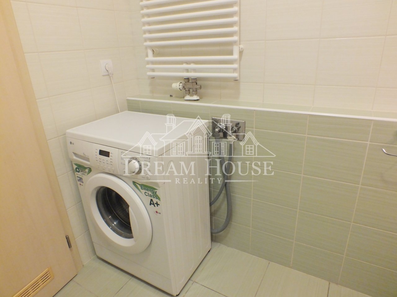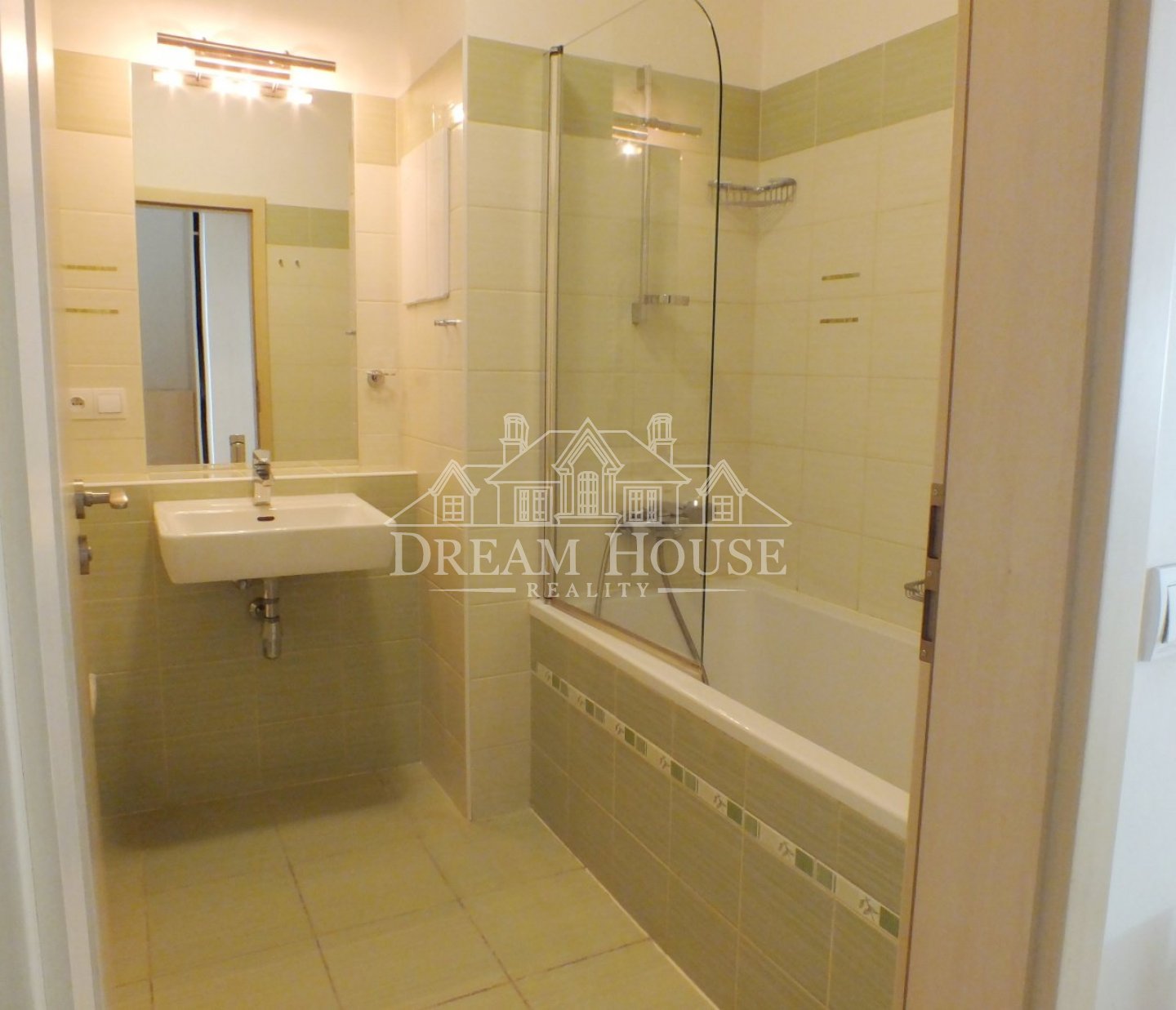 Koupelna s vanou, toaletou a pračkou. Vstupní chodba s vestavěnou skříní a botníky.