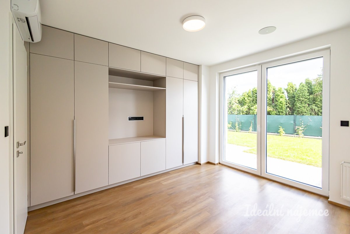 Nabízí se částečně zařízen. Kuchyně disponuje vestavěnými spotřebiči - lednice s mrazákem, myčka nádobí, elektrická trouba, indukční varná deska a digestoř. Obývací pokoj se nabízí bez vybavení.