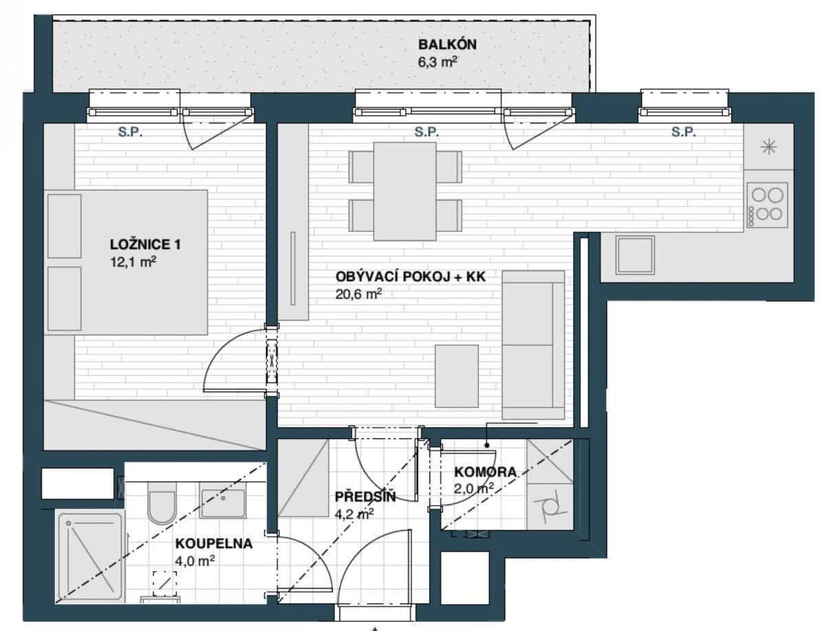 | Dispozice/podlahová plocha: | 2+kk/47 m² |