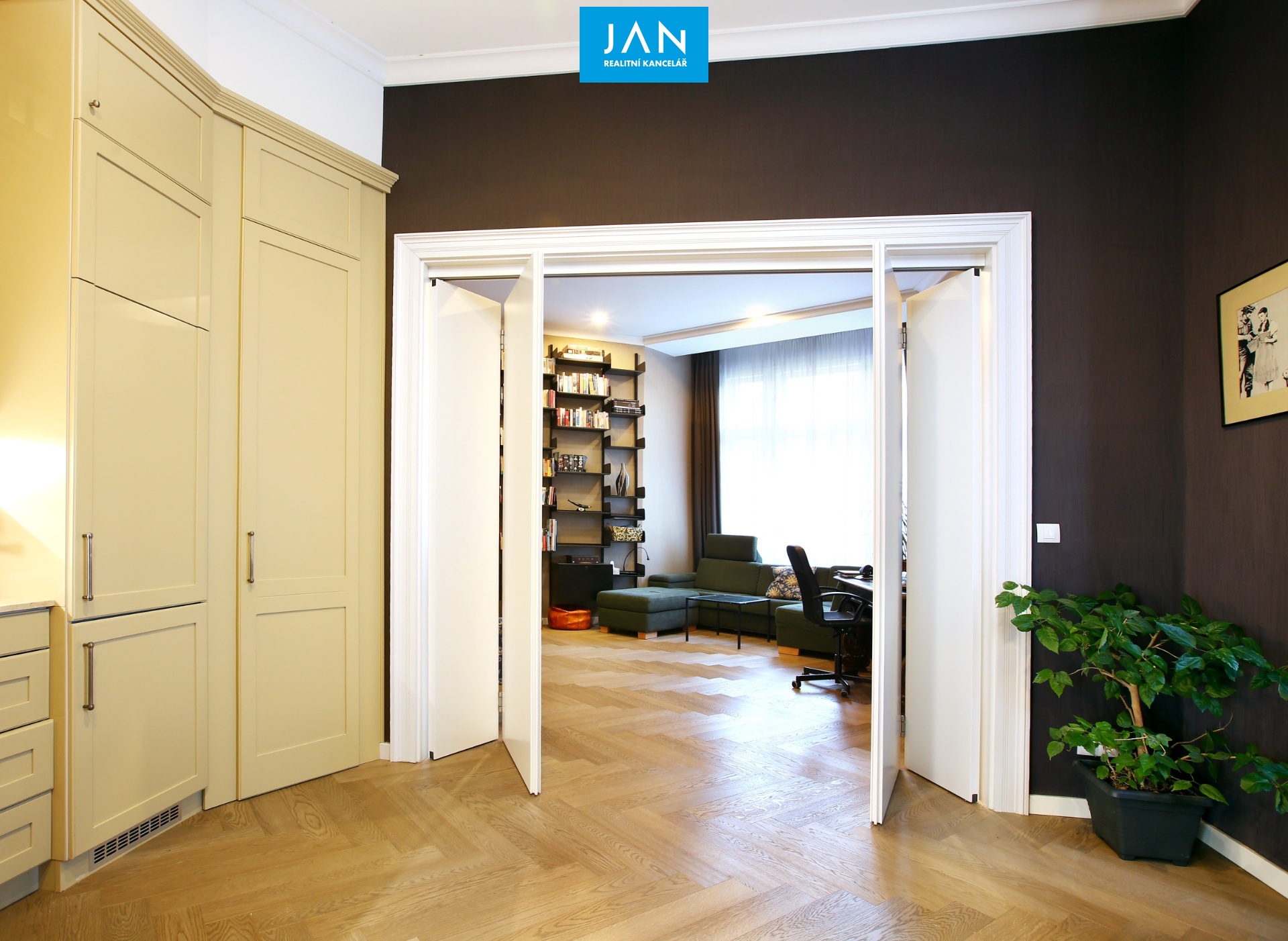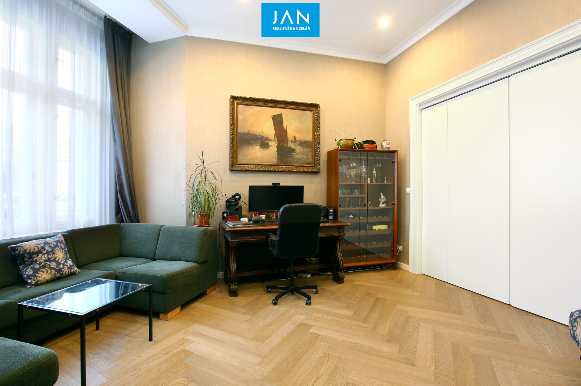 - obývací pokoj (24 m²), který lze díky posuvným dveřím snadno oddělit
