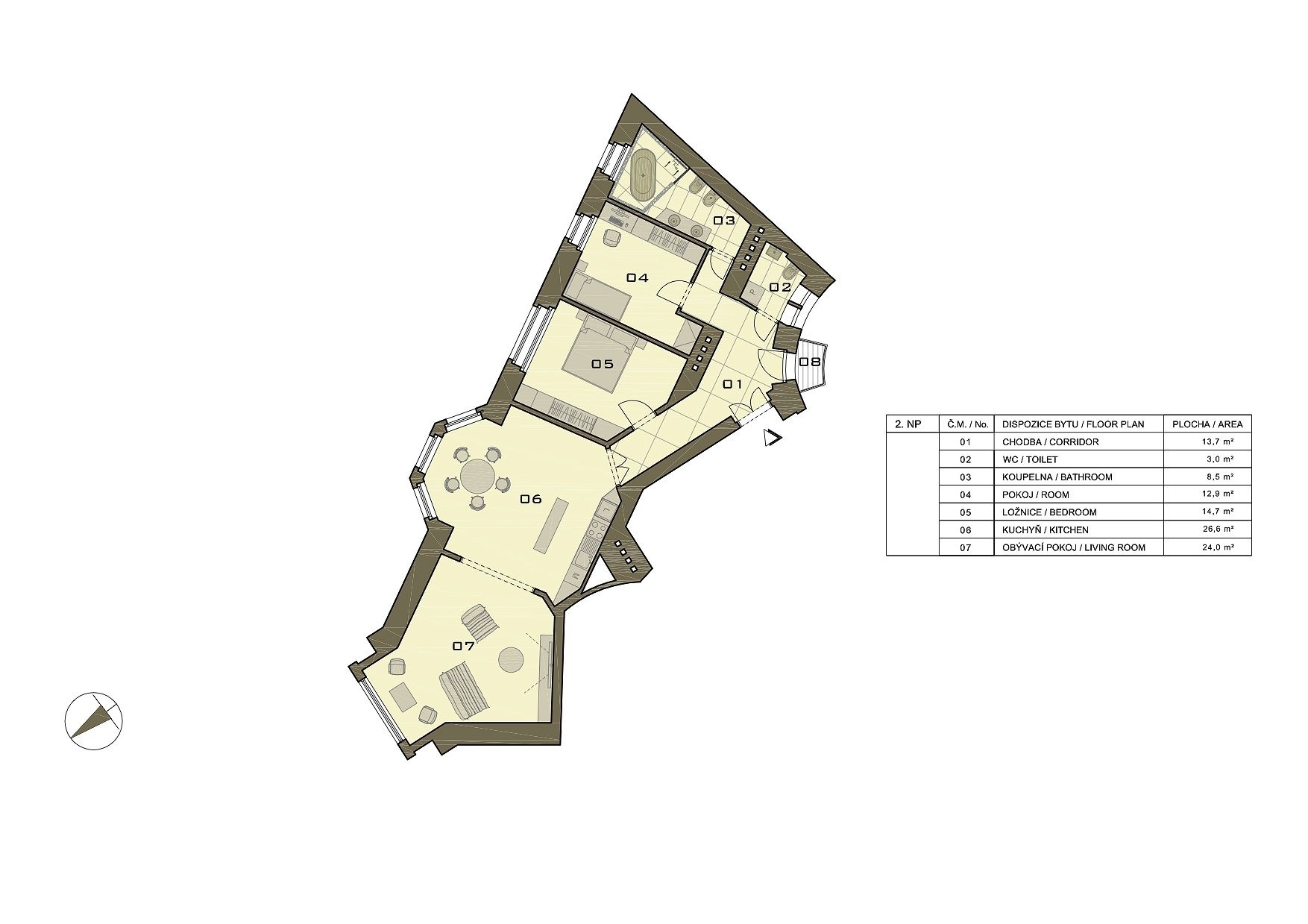- dvě samostatné, neprůchozí ložnice (12,9 m² a 14,7 m²)