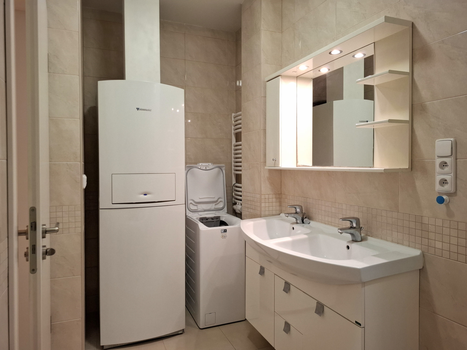- Popis vybavení: kuchyňská linka s vest. spotřebiči (myčka nádobí, el. trouba včetně sklokeramické desky, odsávač par včetně osvětlení, mikrovlnná trouba, kombinovaná lednice s mrazákem), v koupelně dále pračka s inte