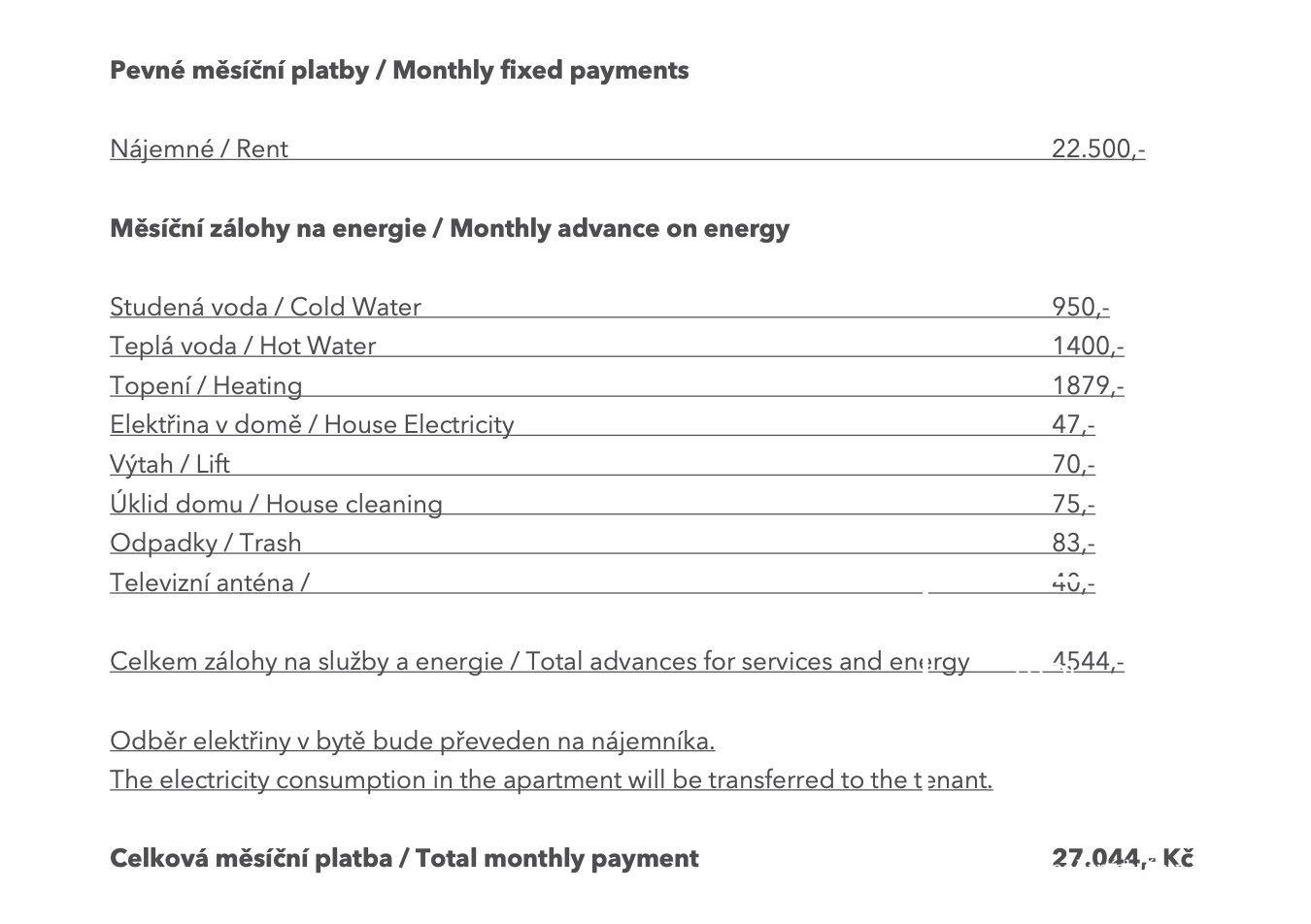 Nájemné je 22.500,- Kč / měsíčně + zálohy na 4.544,- zálohy na energie a služby, které se skládají z: