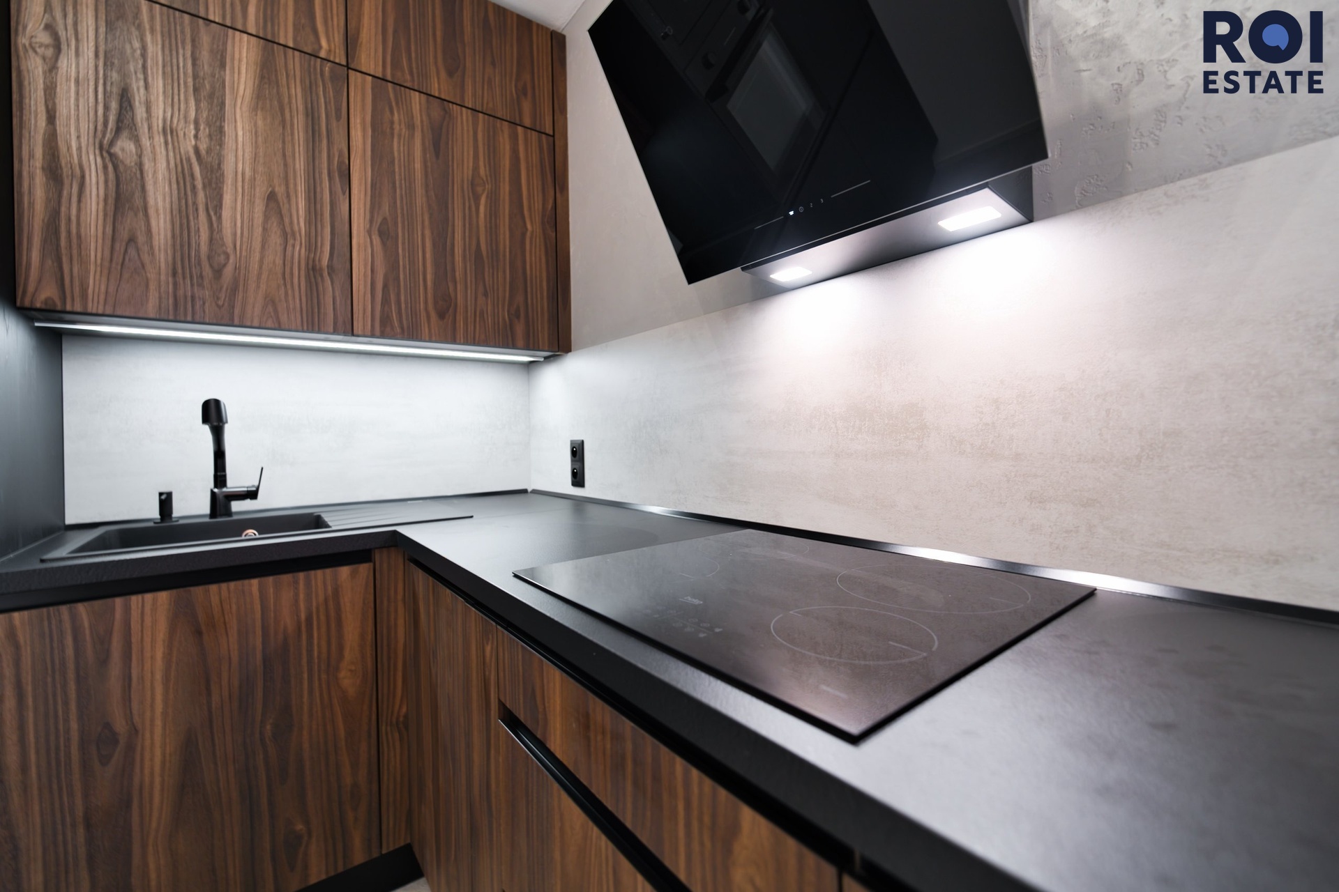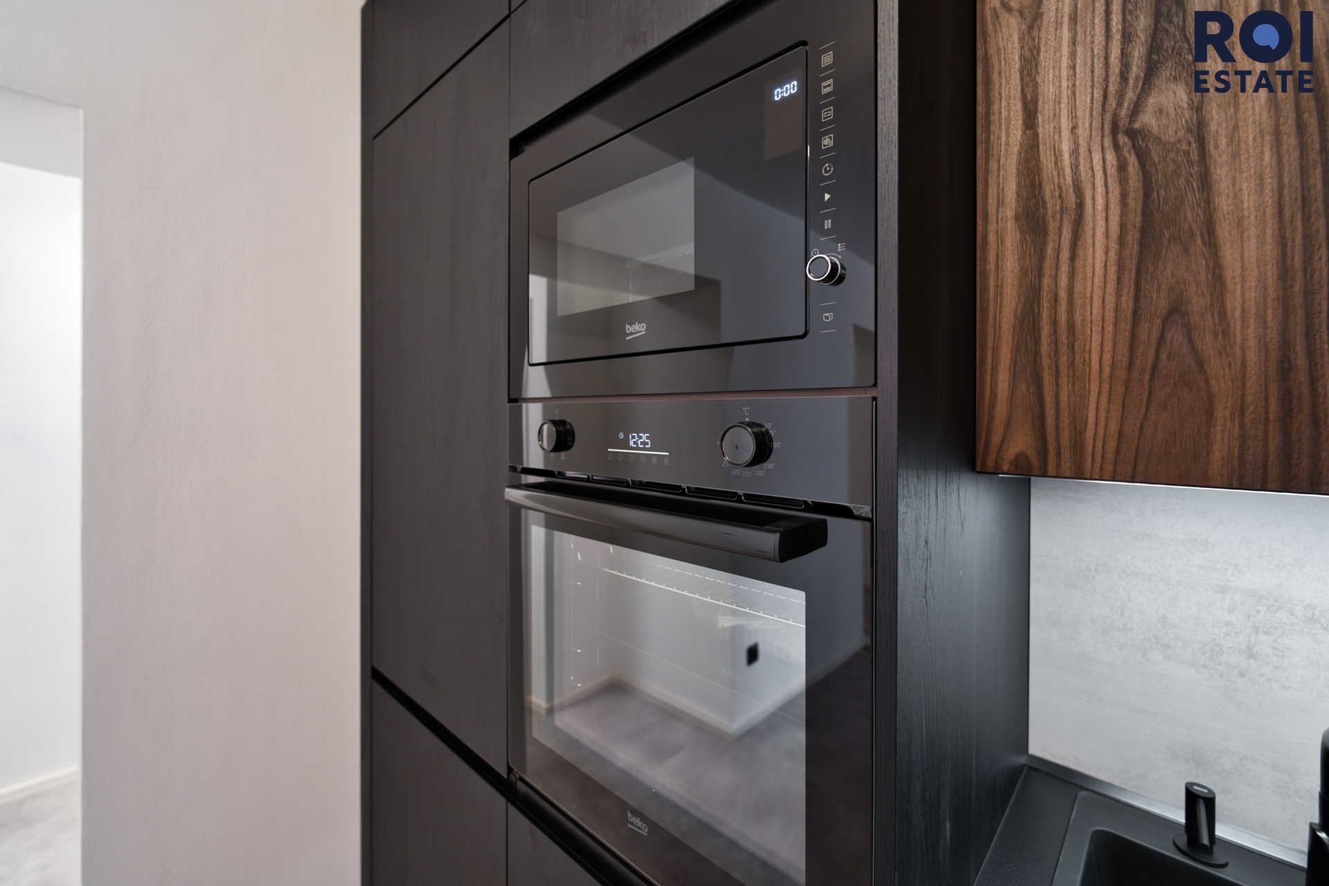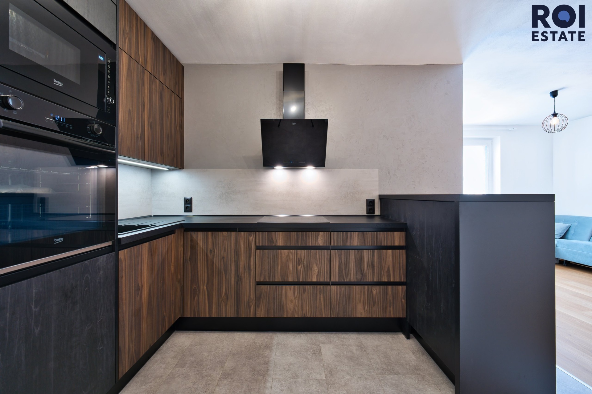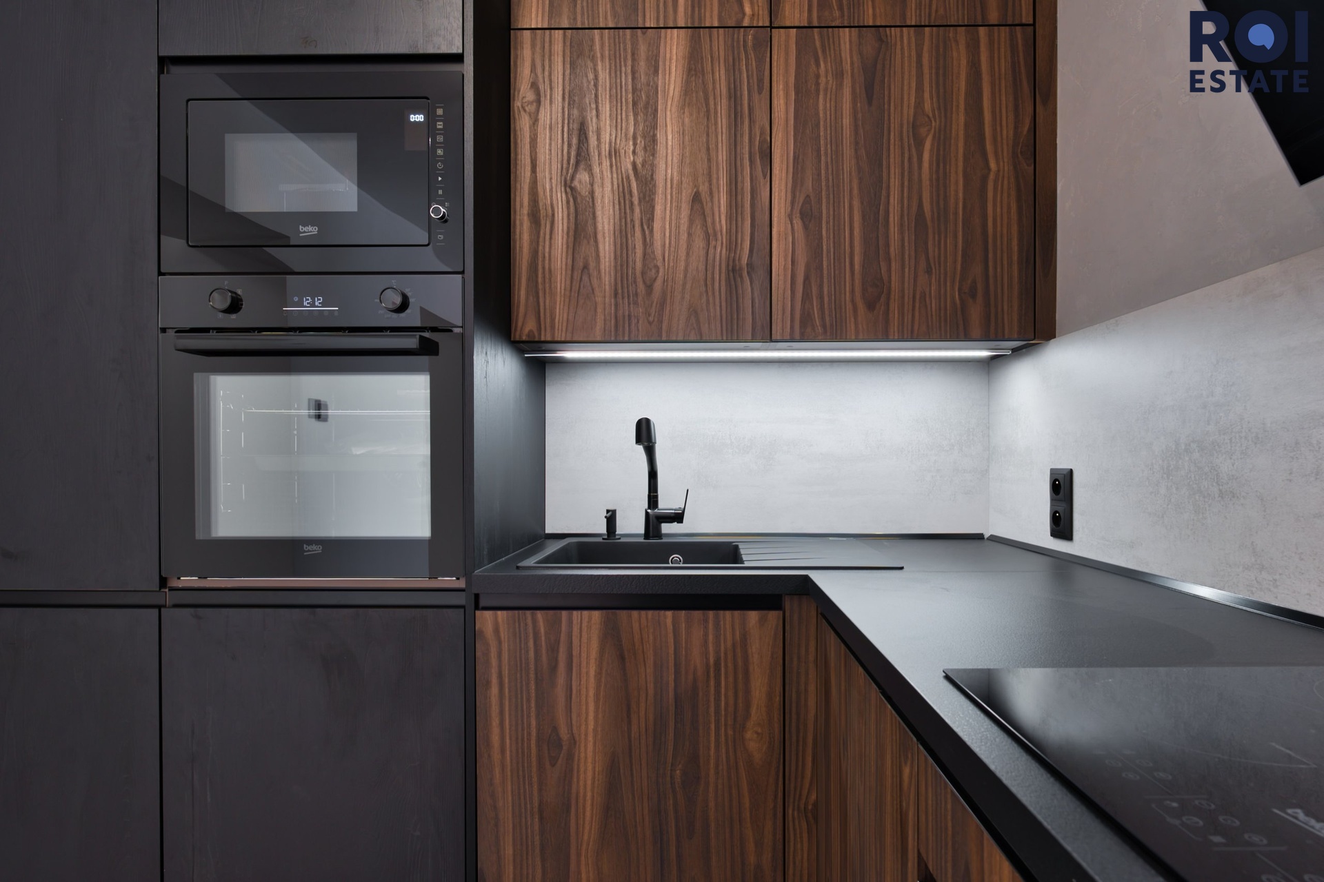 Interiér je laděn do nadčasové elegance. Kuchyň v tmavých tónech je plně vybavena vestavěnými spotřebiči (indukční deska, trouba, mikrovlnná trouba, myčka, digestoř) a přirozeně navazuje na světlý a vzdušný obývací prostor.