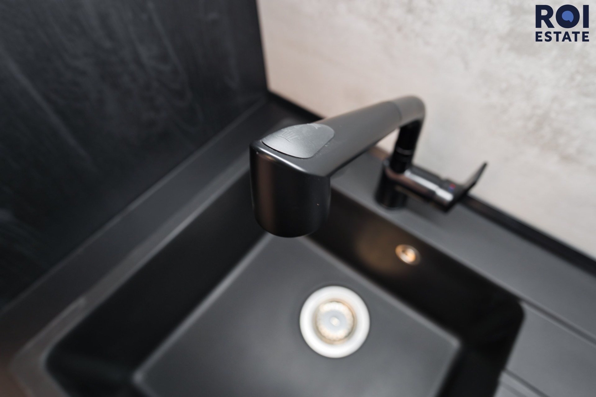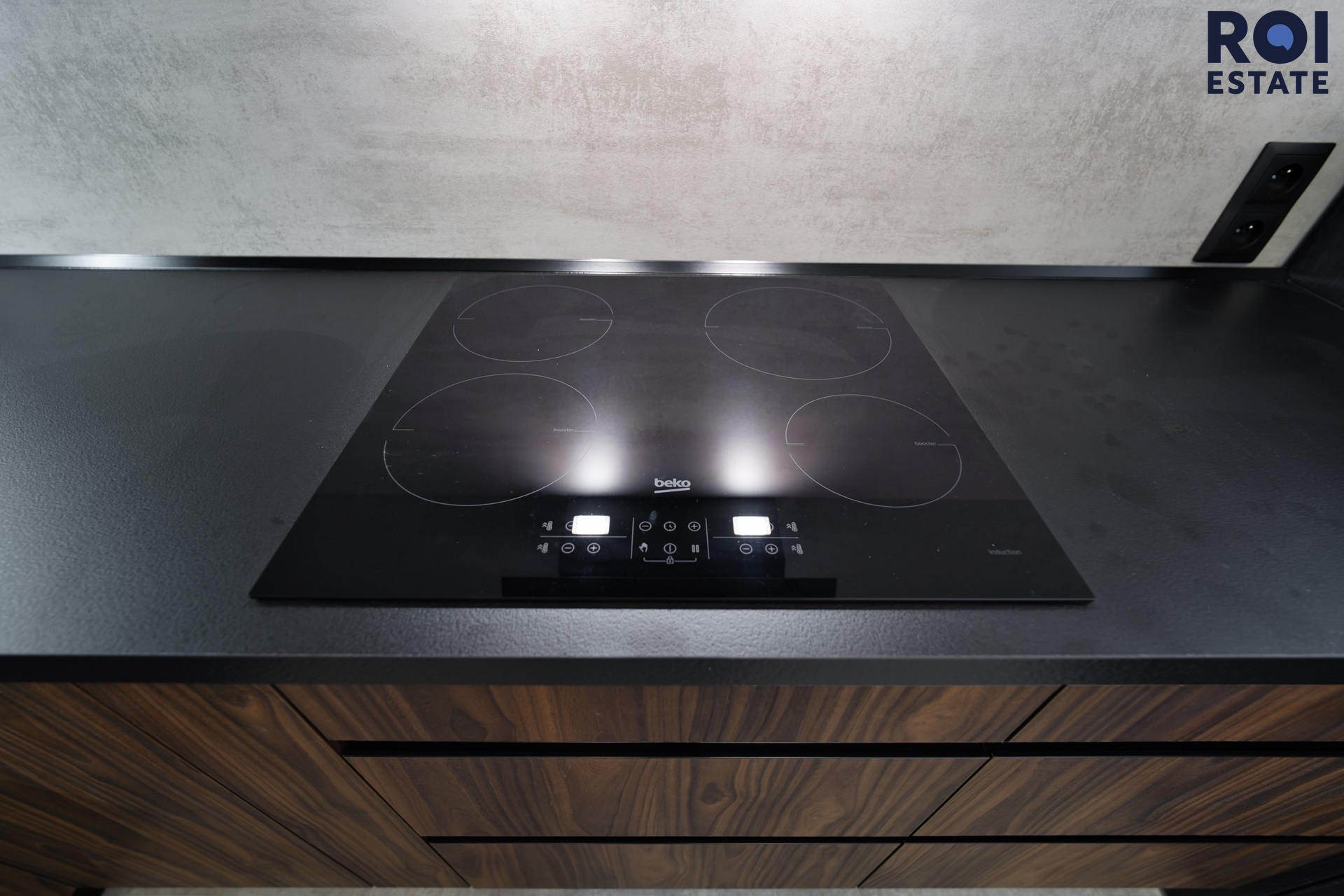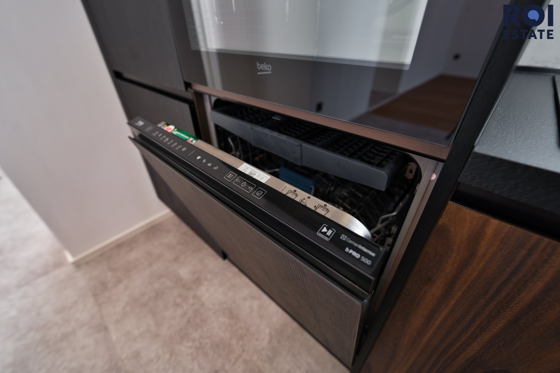 Interiér je laděn do nadčasové elegance. Kuchyň v tmavých tónech je plně vybavena vestavěnými spotřebiči (indukční deska, trouba, mikrovlnná trouba, myčka, digestoř) a přirozeně navazuje na světlý a vzdušný obývací prostor.
