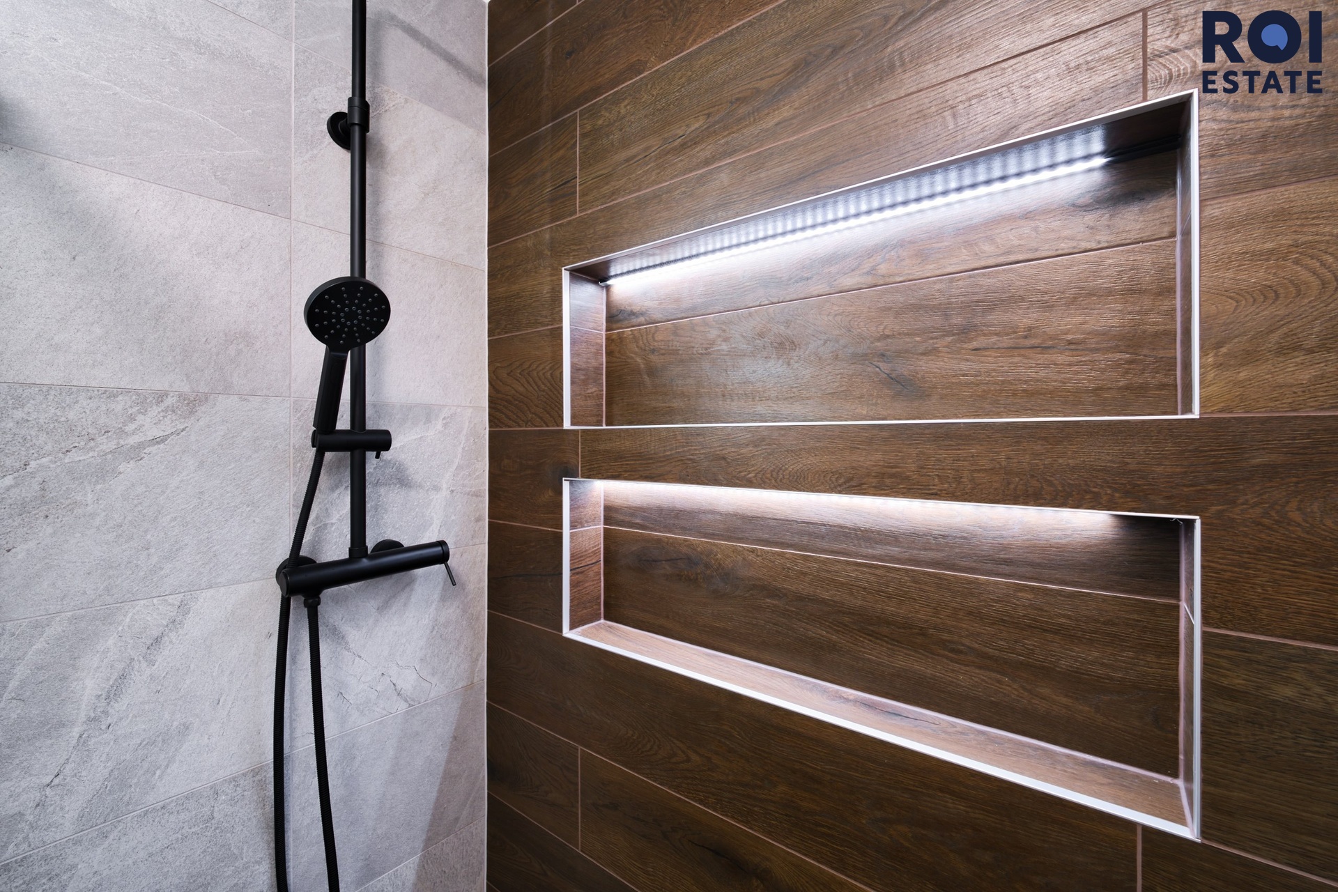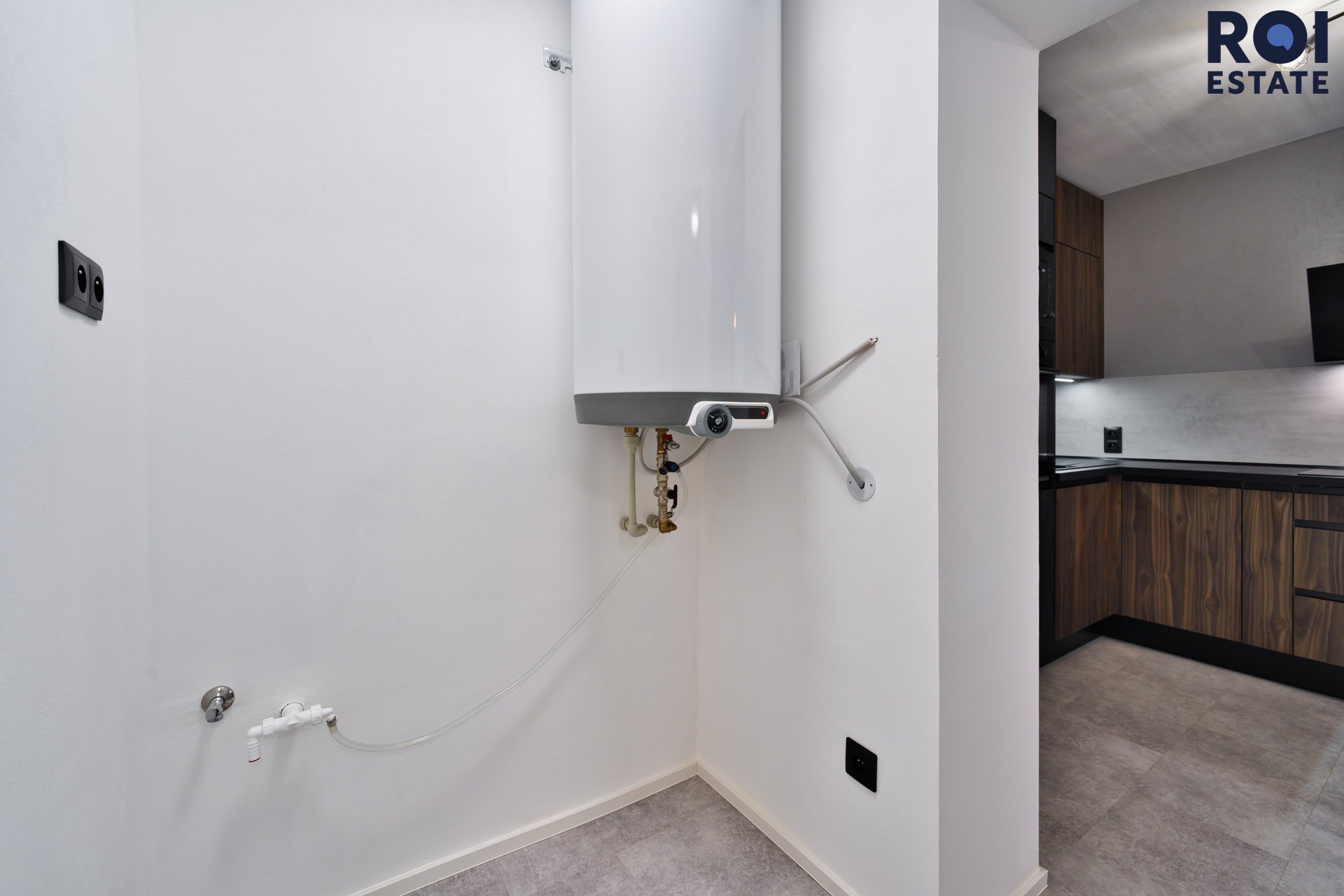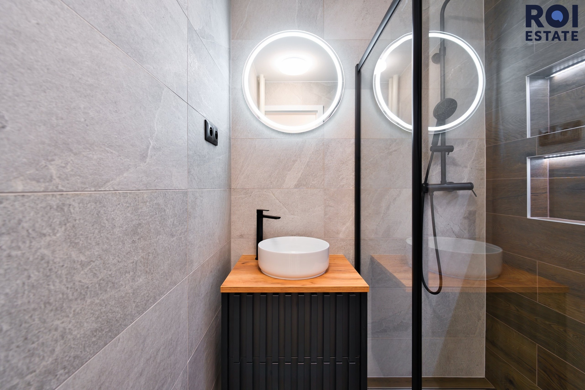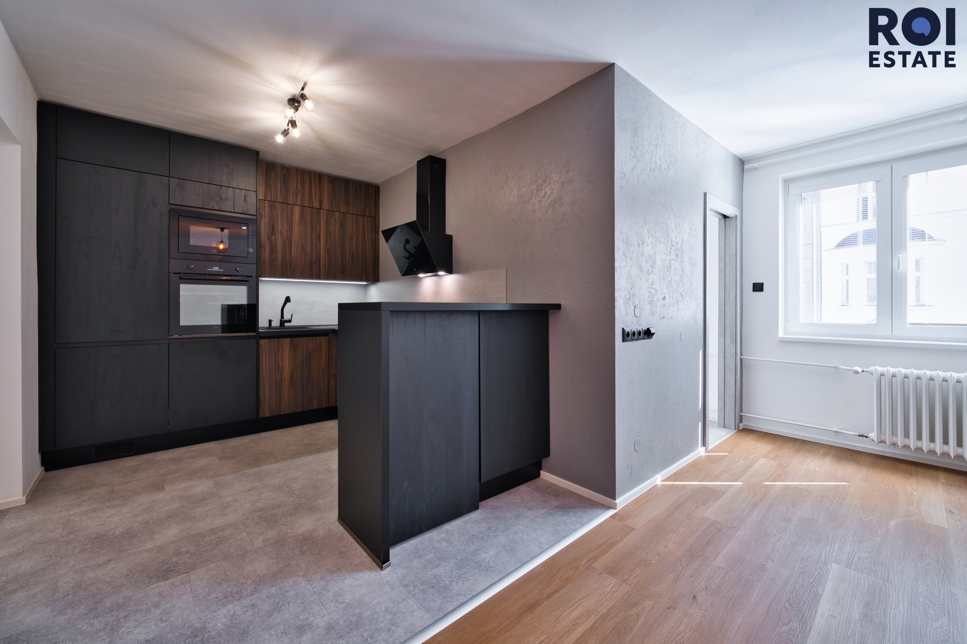 Interiér je laděn do nadčasové elegance. Kuchyň v tmavých tónech je plně vybavena vestavěnými spotřebiči (indukční deska, trouba, mikrovlnná trouba, myčka, digestoř) a přirozeně navazuje na světlý a vzdušný obývací prostor.