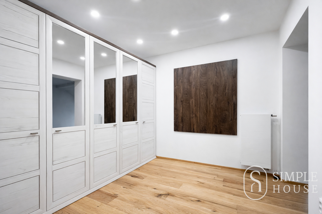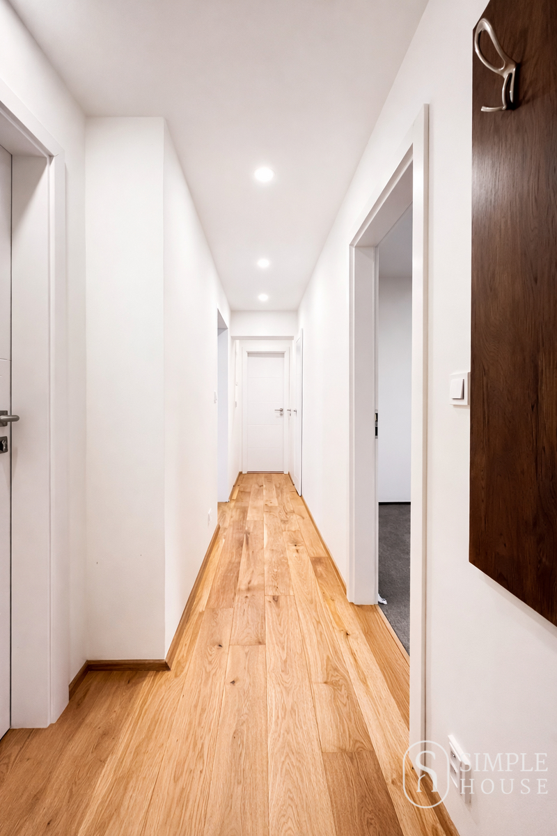 Byt disponuje prostorným obývacím pokojem s kuchyňským koutem, který je vybaven moderními spotřebiči. Dále jsou zde dvě koupelny – což je ideální pro rodiny, dvě samostatné toalety a praktická šatna, která poskytne dostatek úložného prostoru. Kvalitní dřevěné podlahy a okna přispívají k příjemné atmosféře bytu, podlahové vytápění zajistí komfort i v chladných měsících.