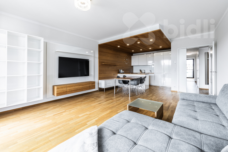 Celková plocha bytu je 97,1 m2 a jeho dispozice je tvořena obývacím pokojem se vstupem na prostorný balkon, sedací soupravu jídelní částí s kuchyňským koutem vybaveným spotřebiči značky Samsung - lednice, mrazák, myčka, varná deska, pečící trouba, odsavač par. V ložnici se nachází postel s vysokou matrací pro větší komfort na spaní a prostorná šatní skříň, ve druhé ložnici nalezneme prostornou šatnu a balkon, který je přístupný z obou pokojů. V koupelně je umístěná vana, sprchový kout a toaleta, další toaleta v bytě je samostatná. Prostorná komora kombinuje úložné prostory s technickou místností (pračka a sušička zn. Miele je součástí vybavení). Podlahy dřevěné z dubu a dlažba, velkoformátová 3-vrstvá okna (s automaticky stahovacími roletami při špatném počasí) dodávající bytu vzdušnost a příjemnou atmosféru.