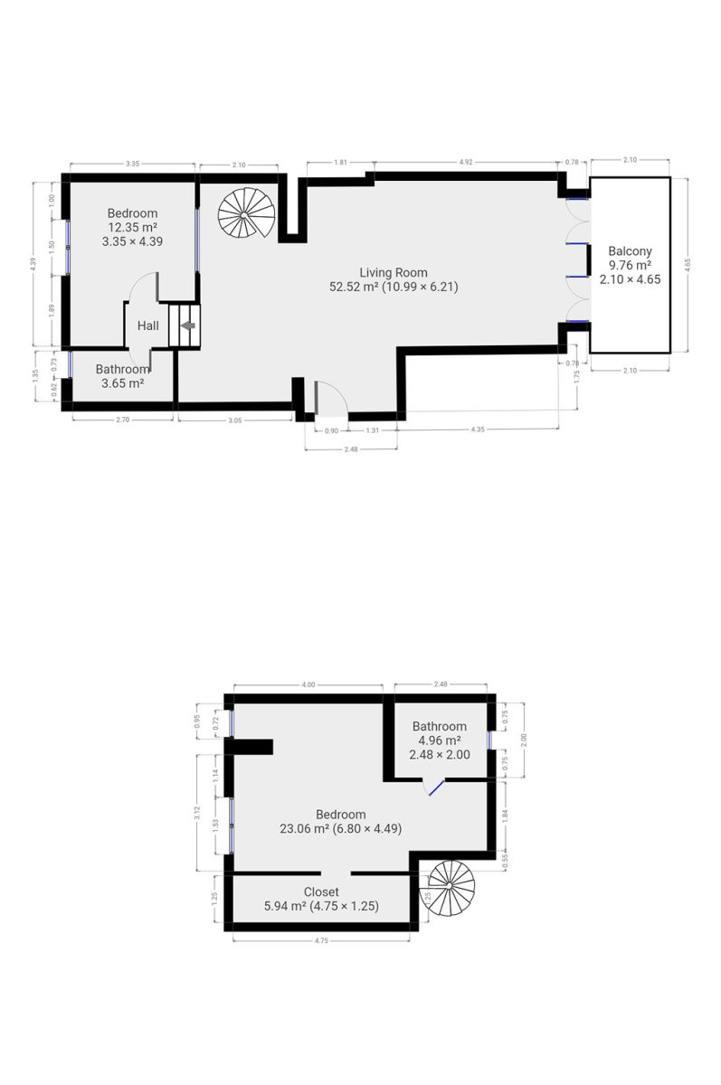 Naproti kuchyni jsou schody, které vedou do druhého patra. Pod a za schody jsou úložné prostory. Vedle kuchyně můžeme nalézt vstup do mezipatra, kde se nachází dětský pokoj a koupelna s toaletou. V druhém patře se nachází pracovní stůl s židlí, druhá koupelna s pračkou a ložnicí. Součástí ložnice je i knihovna a prostorná šatna. Po celém bytě jsou dřevěné a laminátové podlahy a klimatizace. Na oknech jsou elektrické rolety.