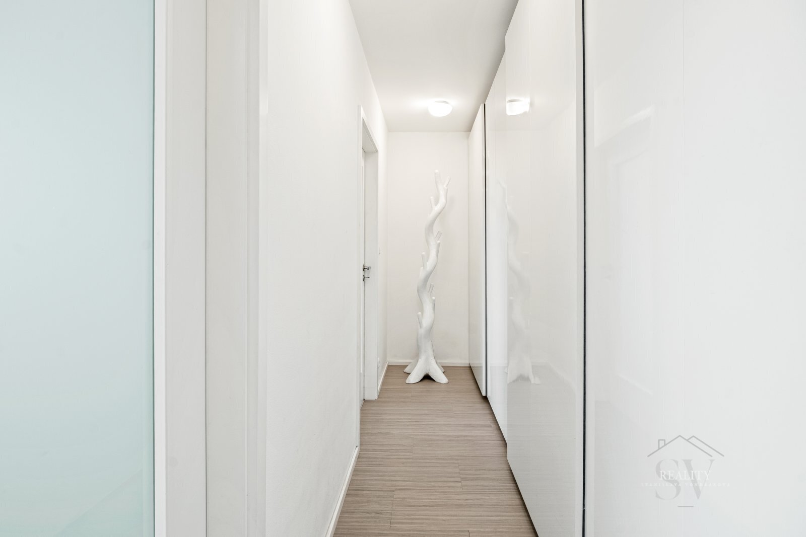 Na podlahách je marmoleum – odolné, tiché a velmi snadné na údržbu. Velkou předností je maximálně využitý úložný prostor: vestavěné skříně v chodbě v bílém lesku včetně botníku, promyšlené úložné prvky v koupelně, pračka je elegantně skrytá ve vestavbě a je zde příprava na sušičku. Interiér tak působí čistě, vzdušně a klidně.