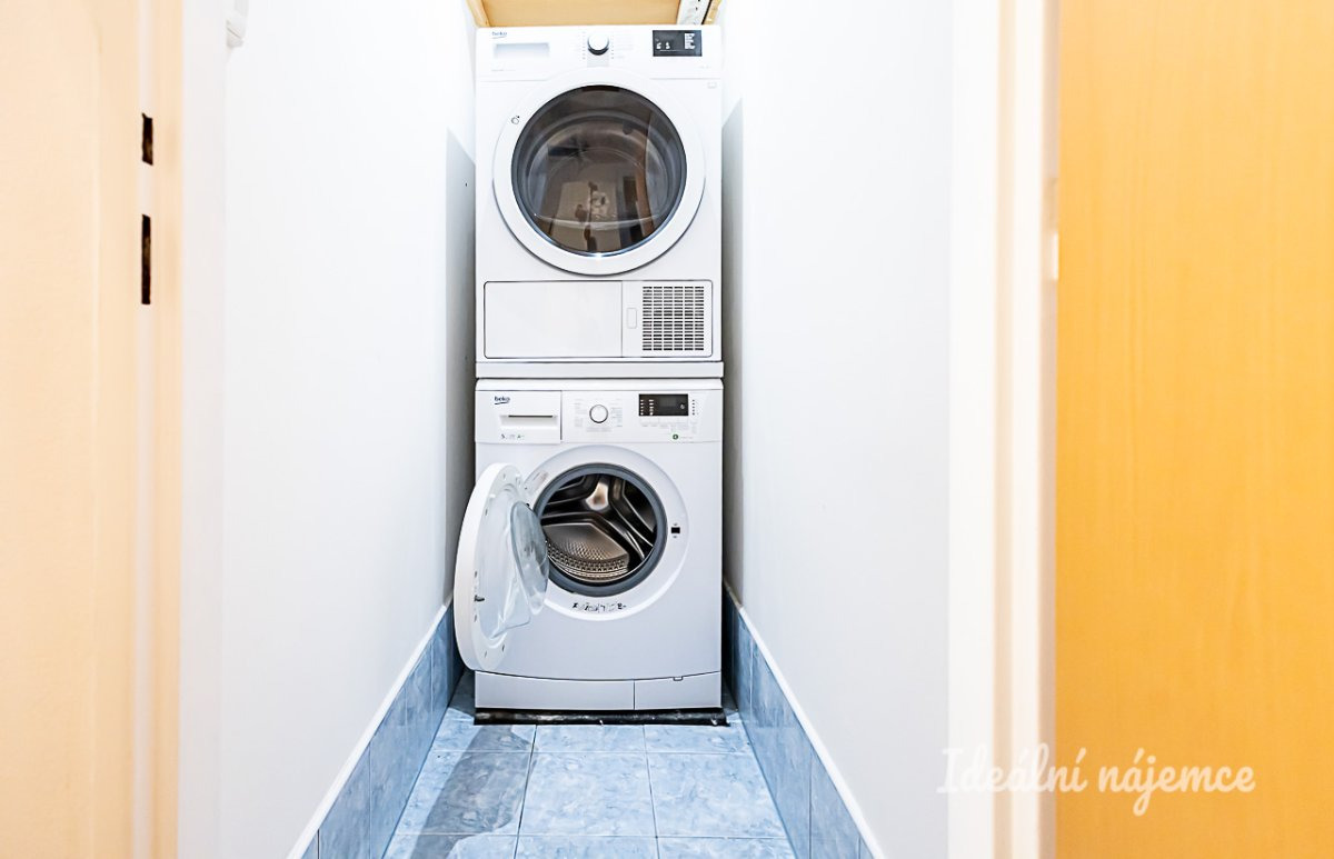 Byt se pronajímá jako nezařízený, což budoucím nájemníkům umožňuje vybavit si interiér podle vlastních představ. Kuchyňská linka je kompletně vybavená spotřebiči – k dispozici je varná deska, elektrická trouba, digestoř, myčka i lednice s mrazákem. Obývací pokoj nabízí dostatek prostoru pro spojení relaxační zóny s jídelním koutem. Další dva samostatné pokoje jsou vhodné jako ložnice, dětský pokoj nebo pracovna. Koupelna je osazena vanou a umyvadlem se skříňkou, toaleta je oddělená. Praktickým doplňkem je samostatná místnost určená pro pračku a sušičku.