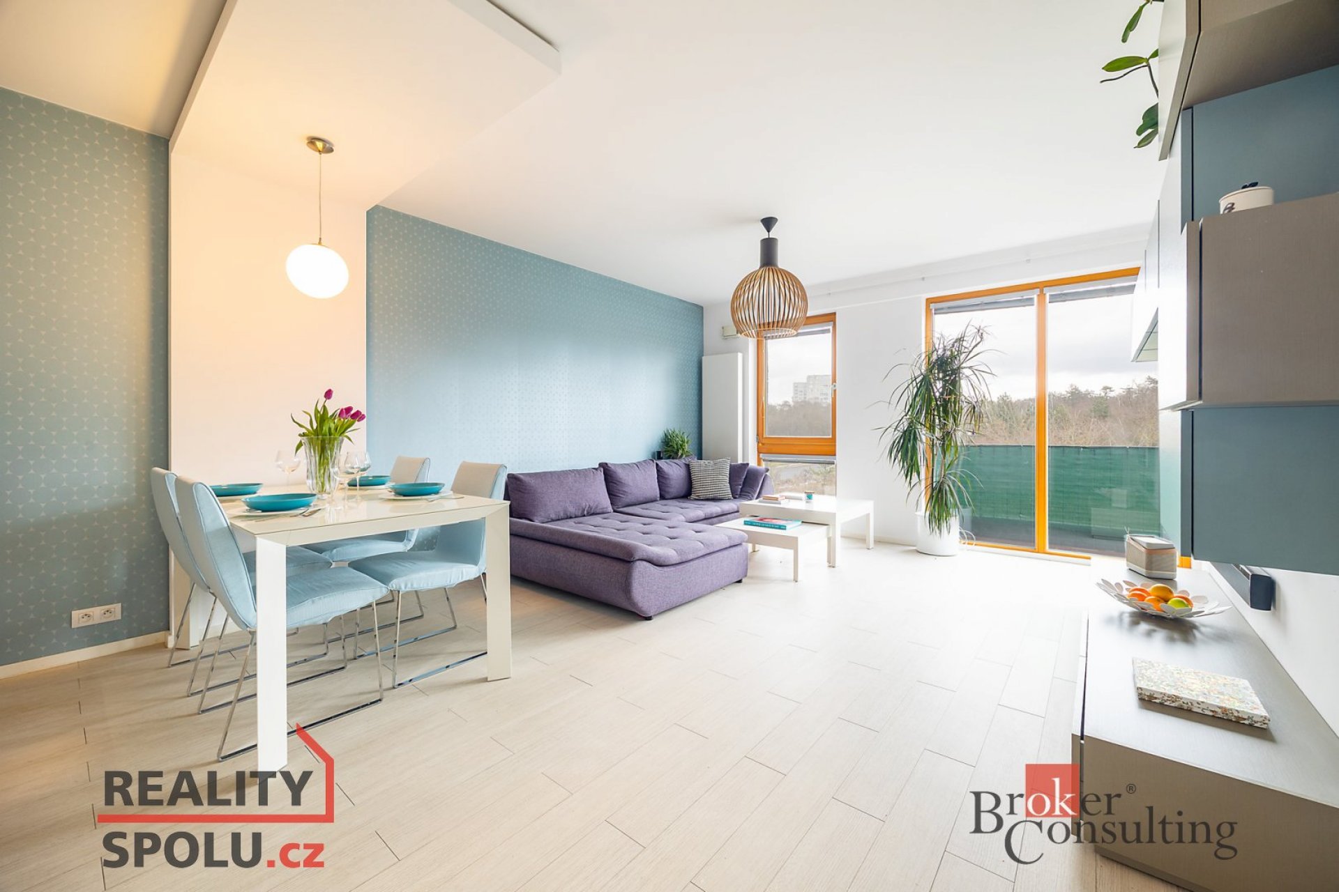 Nabízíme k pronájmu nadstandardní, plně vybavený byt o dispozici 3+kk s terasou, situovaný v nejvyšším podlaží komorního rezidenčního domu v projektu Tulipa Modřany, klidné zeleného prostředí v blízkosti Modřanské rokle.
