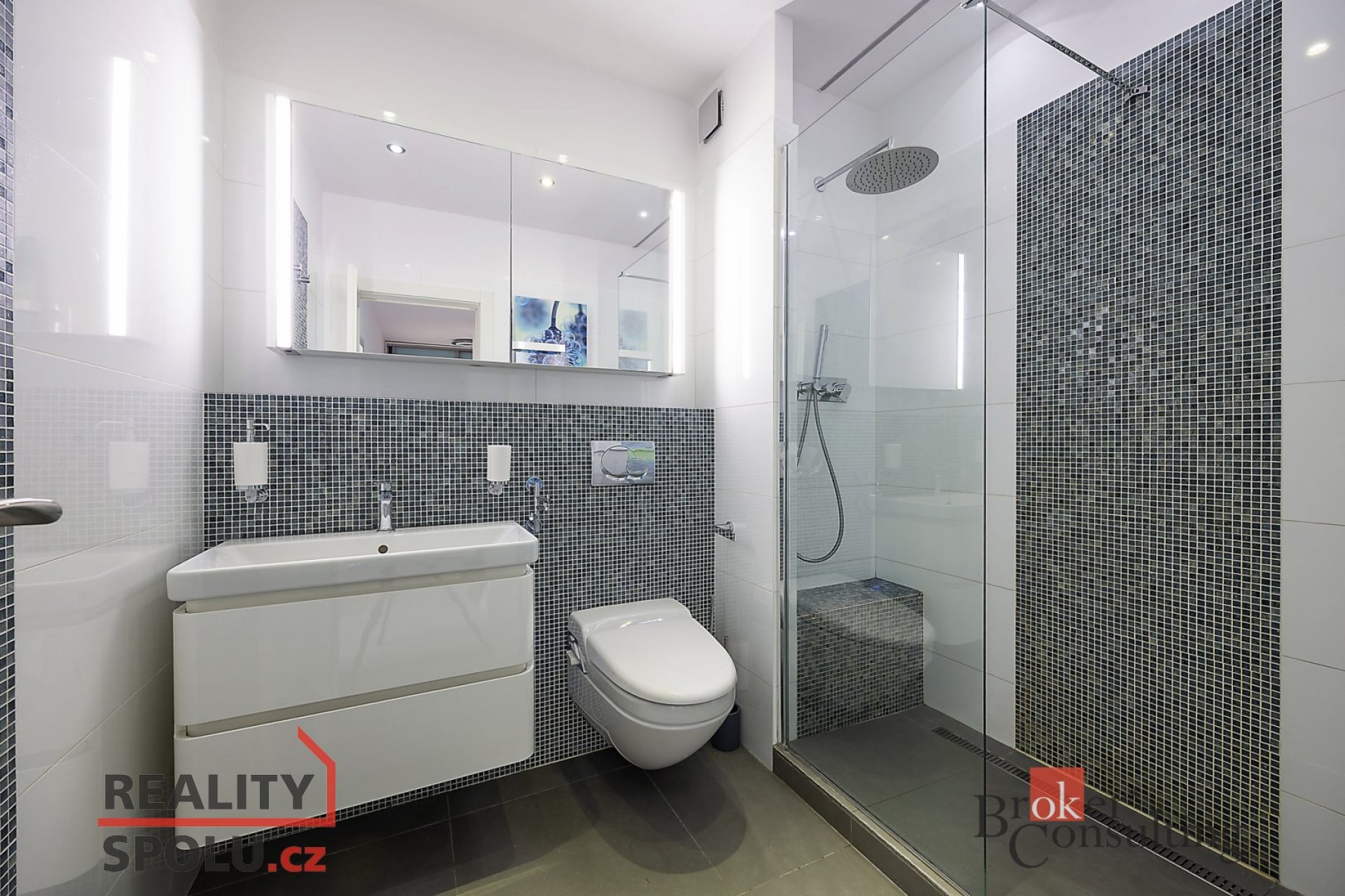 Koupelnu se sprchovým koutem, umyvadlem a toaletou. Na chodbě jsou vestavěné skříně a také místnost s pračkou zn. Miele. Byt má opravdu dostatek úložného prostoru, vestavěné skříne na míru. Kdyby nestačilo místo na uložení vašich věcí přímo v bytě, je k dispozici také prostorný a bezpečně řešený sklep. Není to sklepní kóje, ale prostorná zděná uzamykatelná místnost. Vejdou se do ní kola, sportovní vybavení. Prostě to co nepoužíváte každý den.