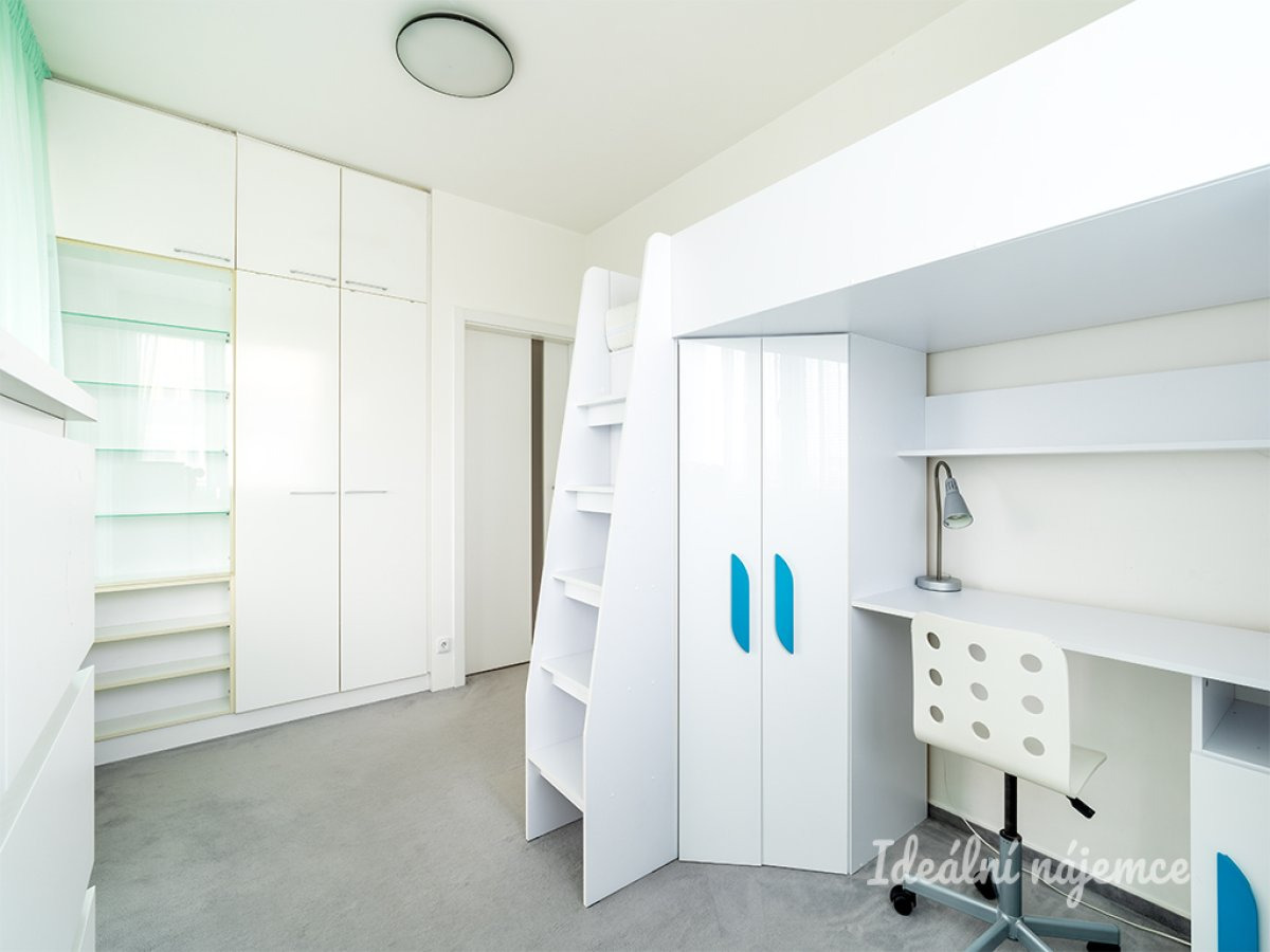 Dětský pokoj nabízí zvýšenou postel s úložnými prostory a dětským stolkem k učení, dále komody a vestavěnou šatní skříň. V prakticky udělané koupelně najdeme sprchový kout, pračku se sušičkou, umyvadlo a komody. Toaleta se nachází samostatně.