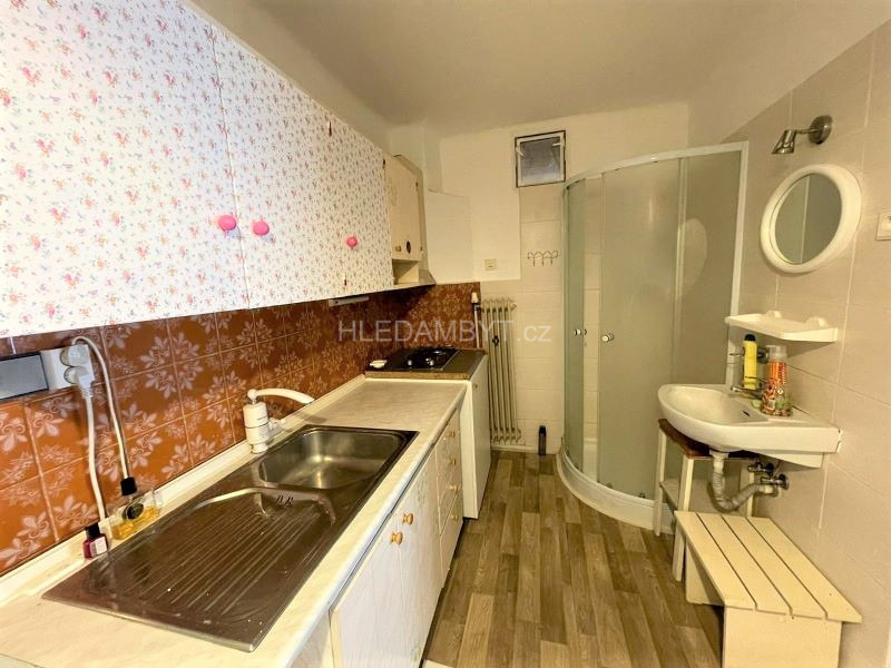 Koupelna v bytě není - sprchový kout i umyvadlo umístěno v kuchyni.