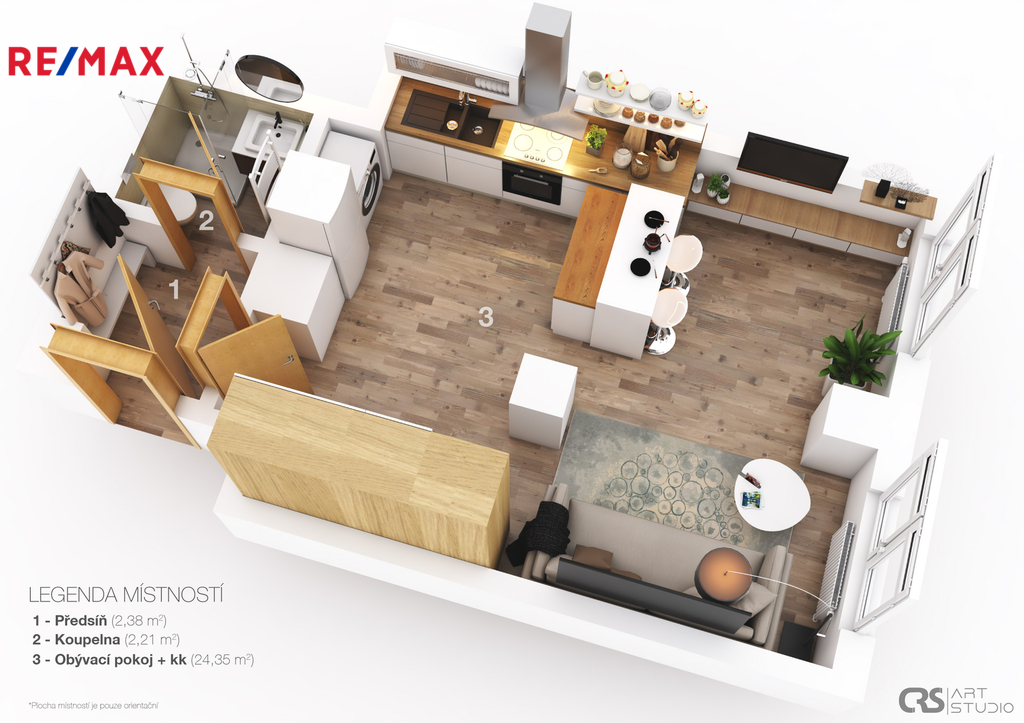 | Dispozice/podlahová plocha: | 1+kk/30 m² |