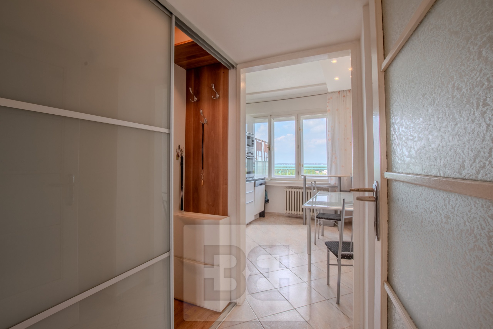 Interiér bytu je světlý, s kvalitními dřevěnými podlahami ve všech místnostech. Dispozice zahrnuje tři samostatné pokoje a oddělenou kuchyň s přístupem na jednu z teras. Všechny místnosti jsou přístupné z centrální předsíně. Kuchyň je vybavena moderní kuchyňskou linkou se spotřebiči – lednicí s mrazákem, dvouplotýnkovou varnou deskou, troubou, digestoří a myčkou. Součástí kuchyně je rovněž praktická komora.