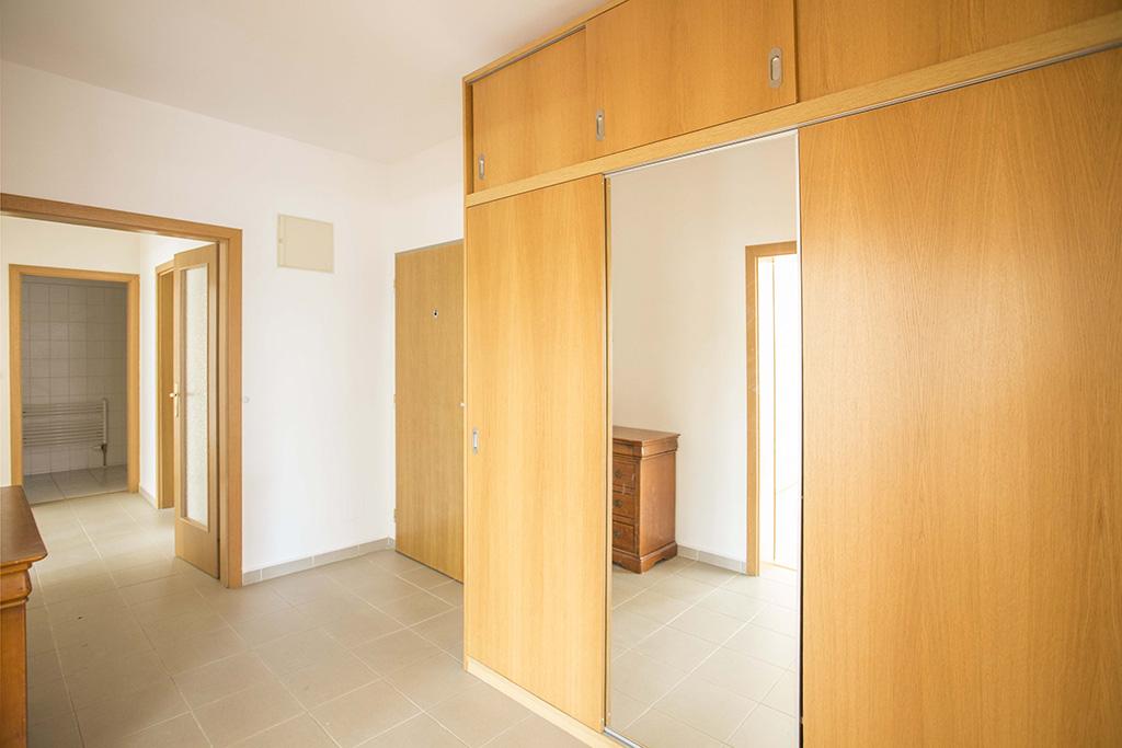 Světlý byt s převážně jižní a západní orientací má velký obývací pokoj, kuchyň vybavenou spotřebiči, vestavné skříně na chodbě, dvě ložnice, koupelnu s vanou a pračkou a extra toaletu.