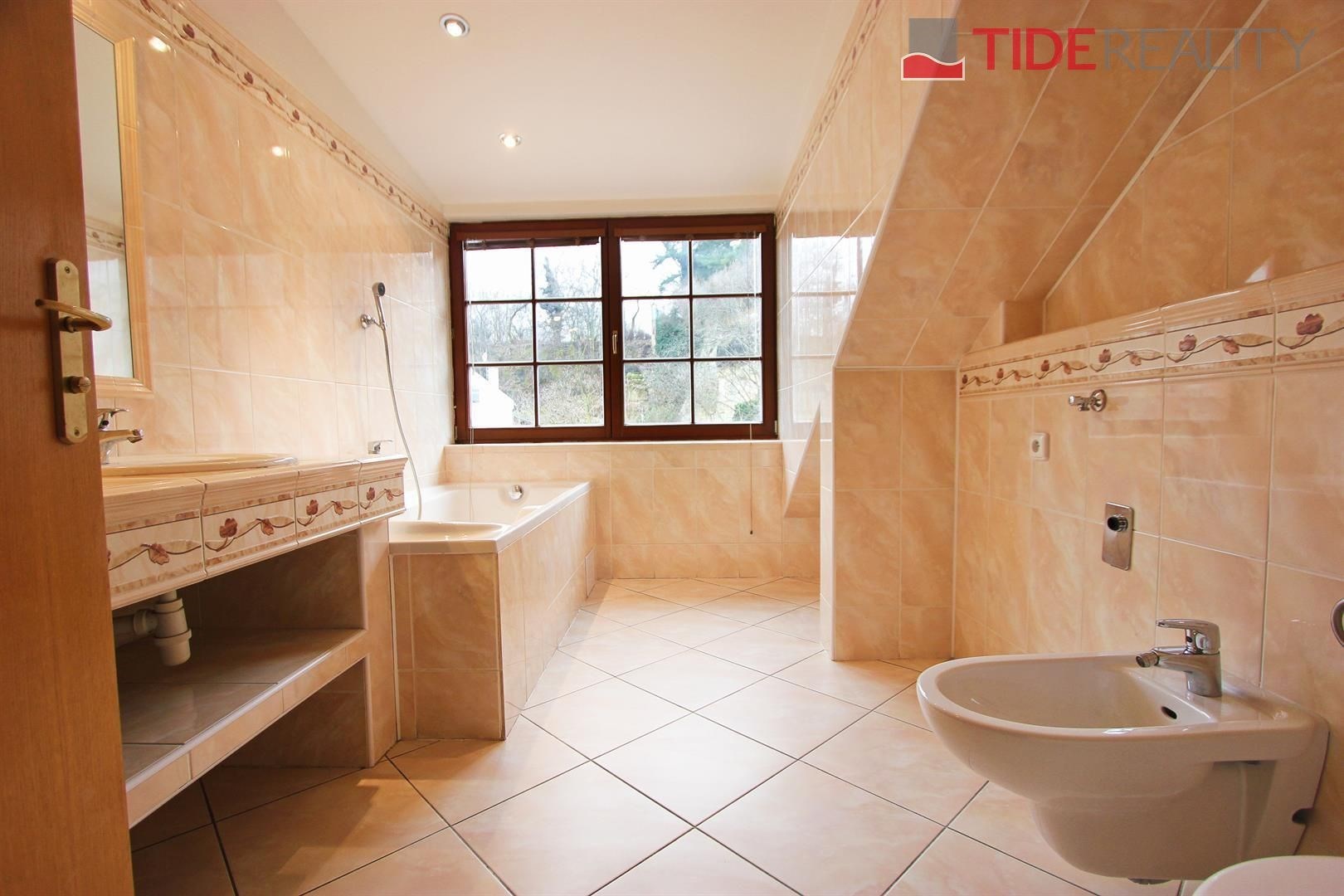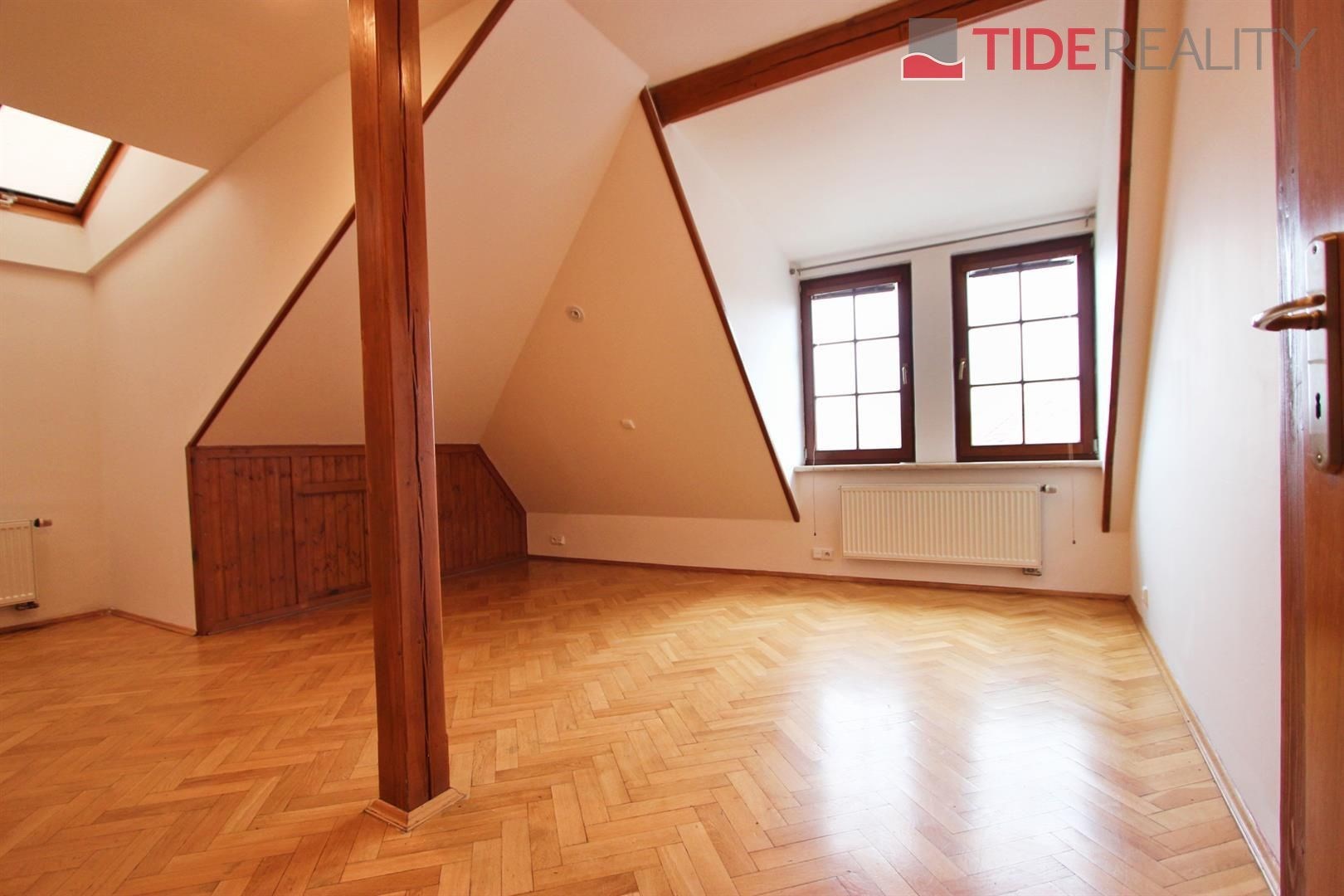 Nabízíme k pronájmu část činžovní vily, mezonetový byt umístěný v 1. patře a podkroví, který má celkovou obytnou plochu 350 m2. Nabízí 4 ložnice, prostorný obývací pokoj s krbem, arkýřem a s přímým vstupem na terasu a zahradu, dále plně vybavená kuchyň s jídelním koutem, 4 koupelny (2 ensuite). V suterénu domu je k dispozici prádelna, sauna s tělocvičnou. Dřevěné podlahy, dlažba, podlahové topení. Garáž pro 2 auta. PENB třída G. K dispozici od 1.3. 2026, prohlídky jsou možné po předchozí domluvě.