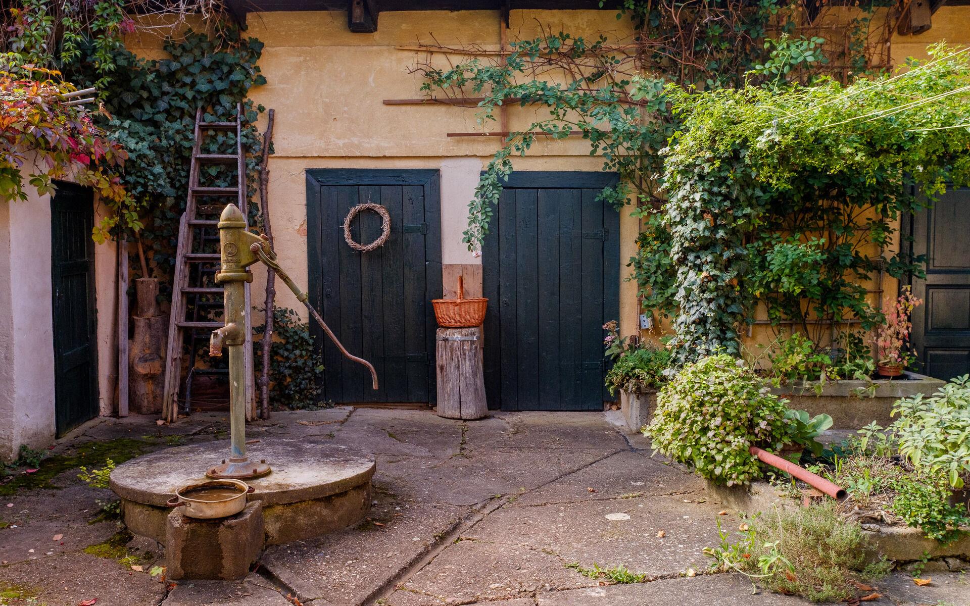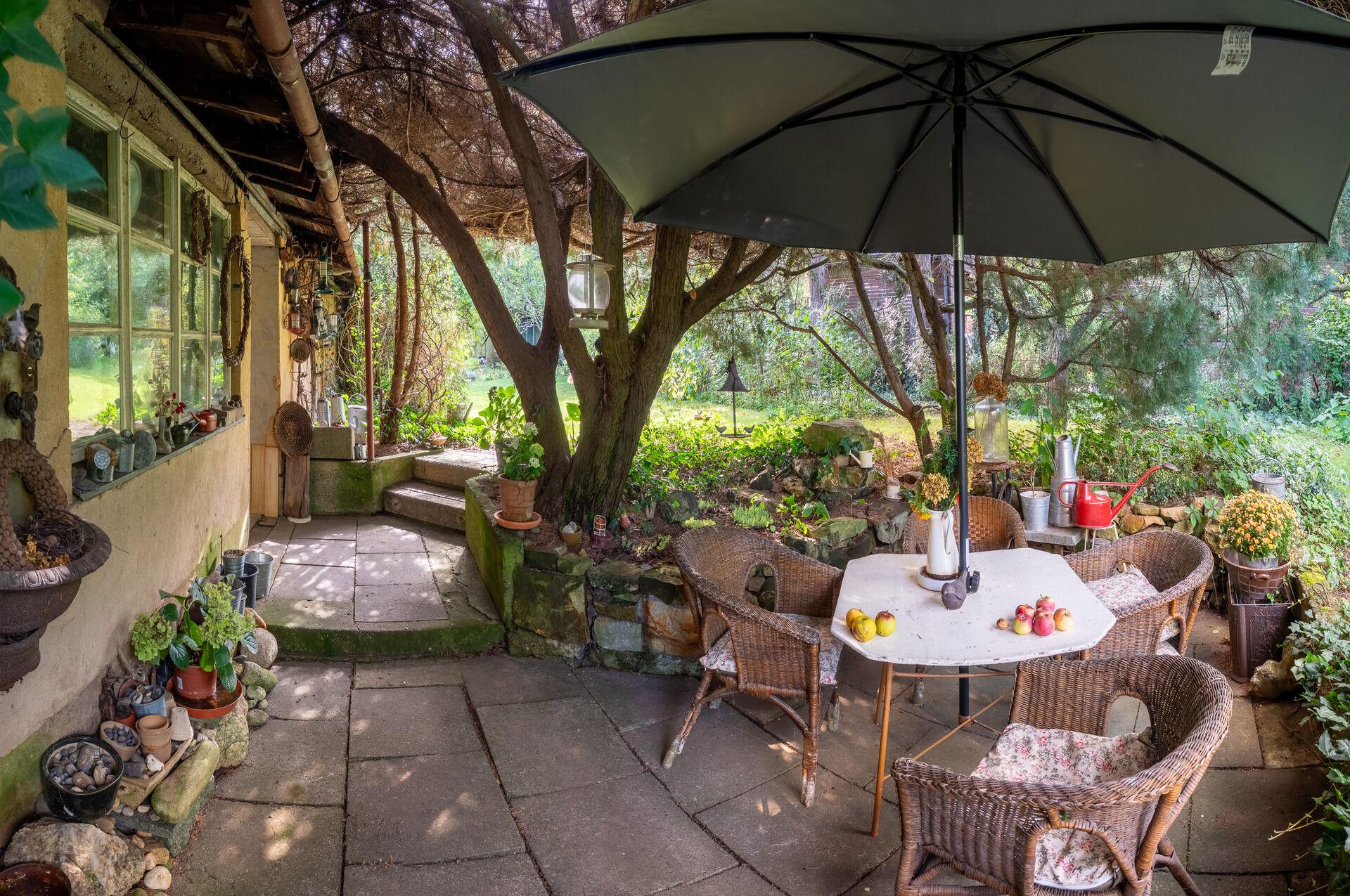 Za domem naleznete sklípek na uskladnění ovoce, dílnu nebo chlívky, které slouží jak k uskladnění zahradnického náčiní tak k práci a uzavírají příjemný dvorek za domem do malebného atria, které pokračuje do stinného koutku vybízejícího k odpolednímu odpočinku za horkých letních dní.