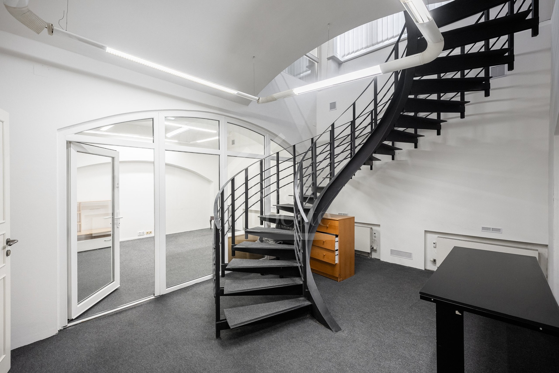 Dispozice ve dvou podlažích nabízí vysokou variabilitu využití – suterénní část je vhodná pro zasedací místnosti, další pracovní prostory, sklad, archiv nebo zázemí pro klienty.