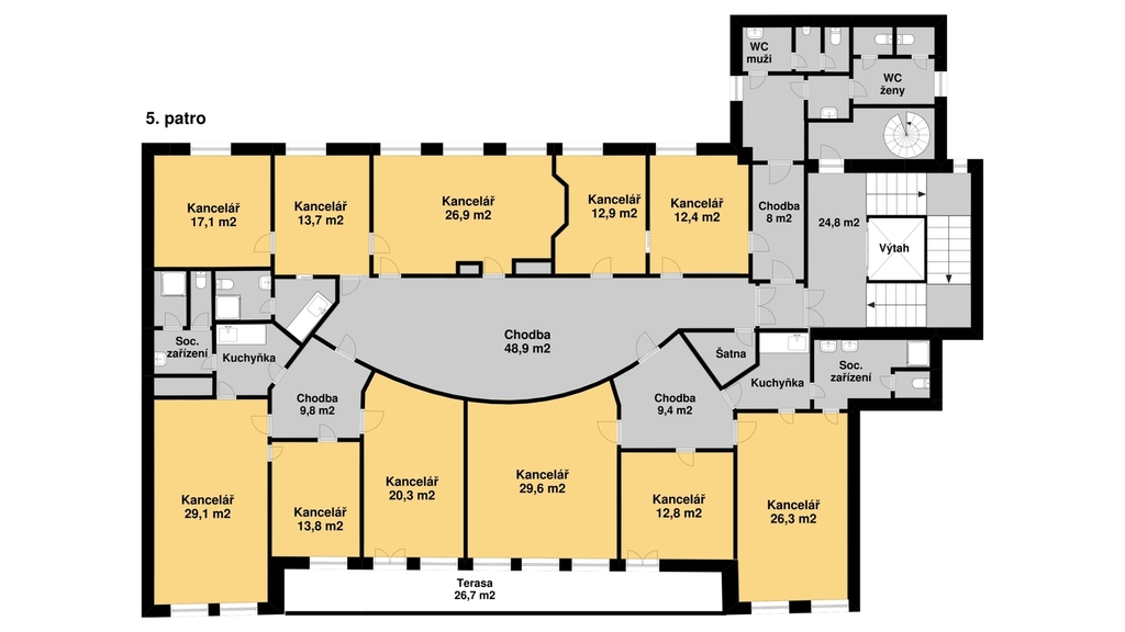 5. patro - 404m2 + terasa 26m2, 11 místností od 12m2 do 30m2, 5x toalety, 2x kuchyňka, skládek