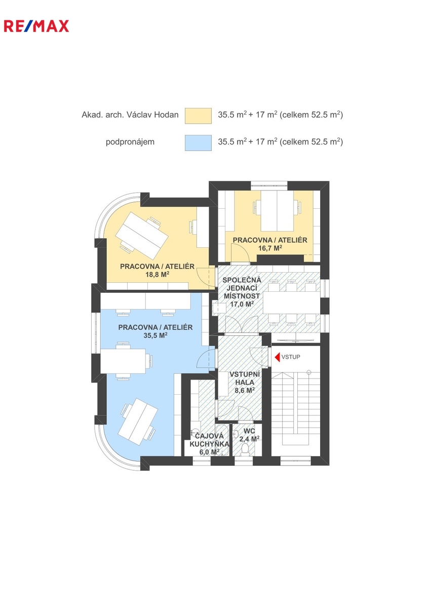 Ideální pronajímaná část zahrnuje ateliér o velikosti 35,5 m² a podíl 17 m² na společných prostorech a konferenční místnosti, celkem tedy 52,5 m².