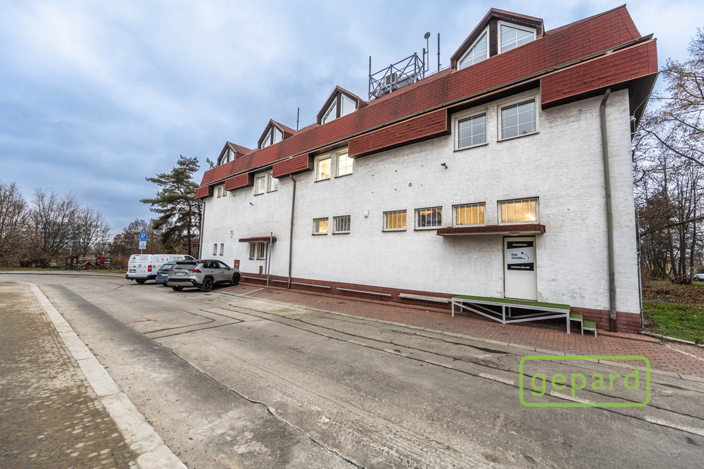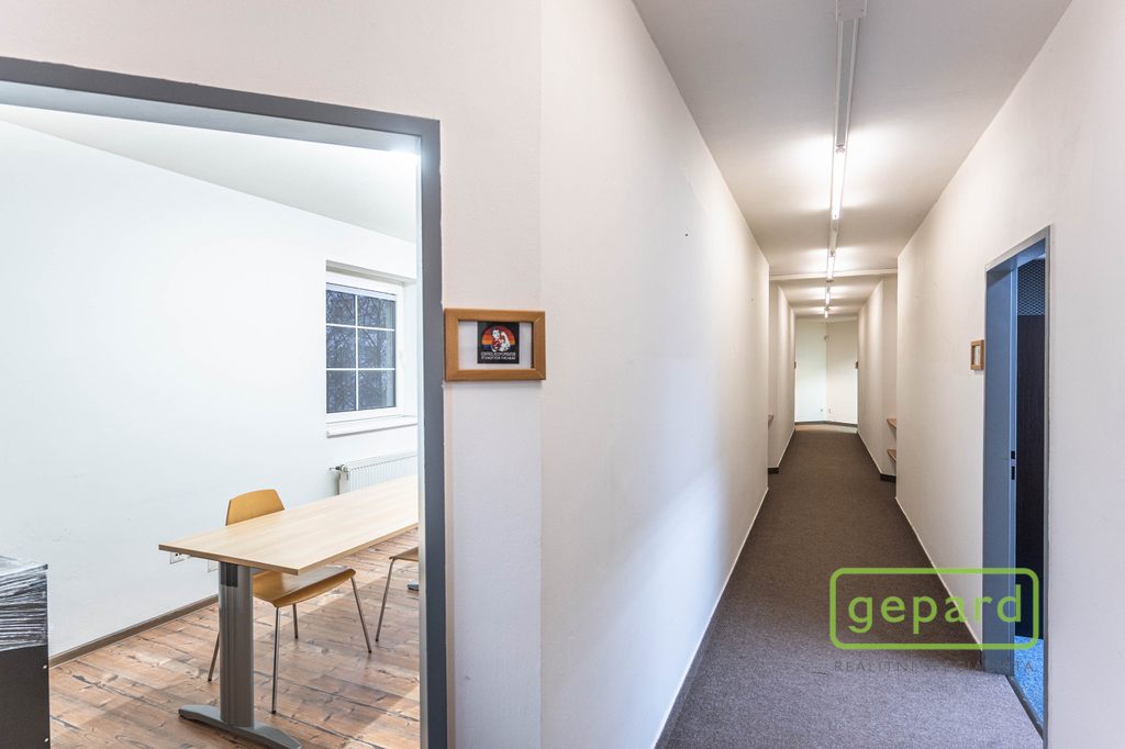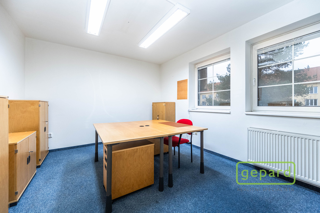 Nabízený prostor o rozloze 188,10 m2 zaujímá celé 2. nadzemní podlaží třípodlažní cihlové budovy. Dispozice je uvedena v přiloženém půdorysu. Je zde šest kanceláří: 41,20 m2; 19,70 m2; 19,60 m2; 19,30 m2; 16,10 m2 a 15,00 m2 a dále kuchyňka, komora, šatna a 2x WC. Vybavení znázorněné na fotografiích může být ponecháno nebo po dohodě vyklizeno. Okna kanceláří směřují na jihovýchod a severozápad, topení je centrální zajištěné společným plynovým kotlem pro dvě podlaží, v prostoru jsou nainstalovány 4 klimatizační jednotky. Celá budova je zabezpečena zabezpečovacím zařízením včetně venkovních kamer. V přízemí budovy je klimatizovaná místnost (3 m2), která může být využita pro datové úložiště. Parkování je možné přímo u budovy v placené zóně.