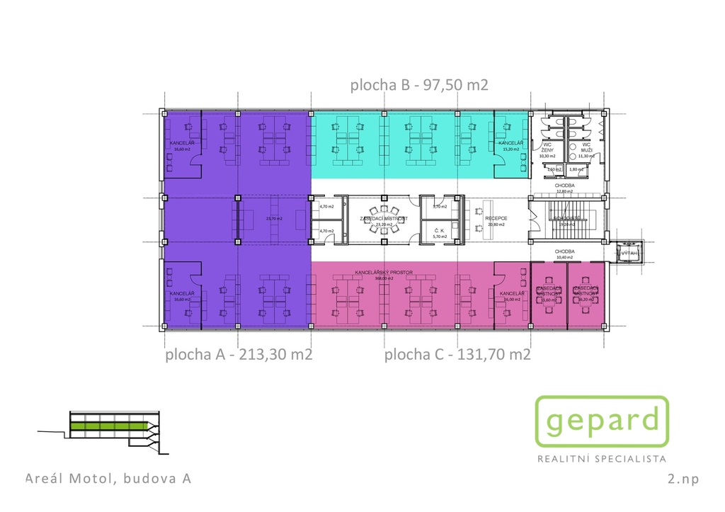 V případě zájmu je možné pronajmout jiné části tohoto patra: 32 m2 (část plochy B), 67,5 m2 (část plochy B), 213 m2 (plocha A) a 131 m2 (plocha C) nebo celé patro dohromady.