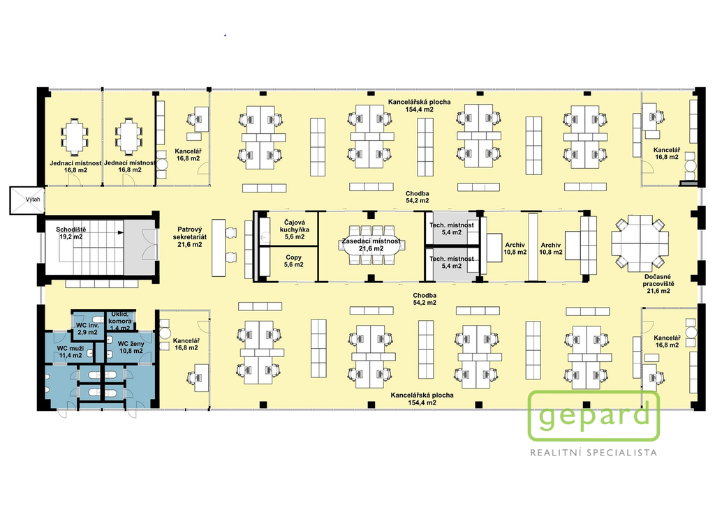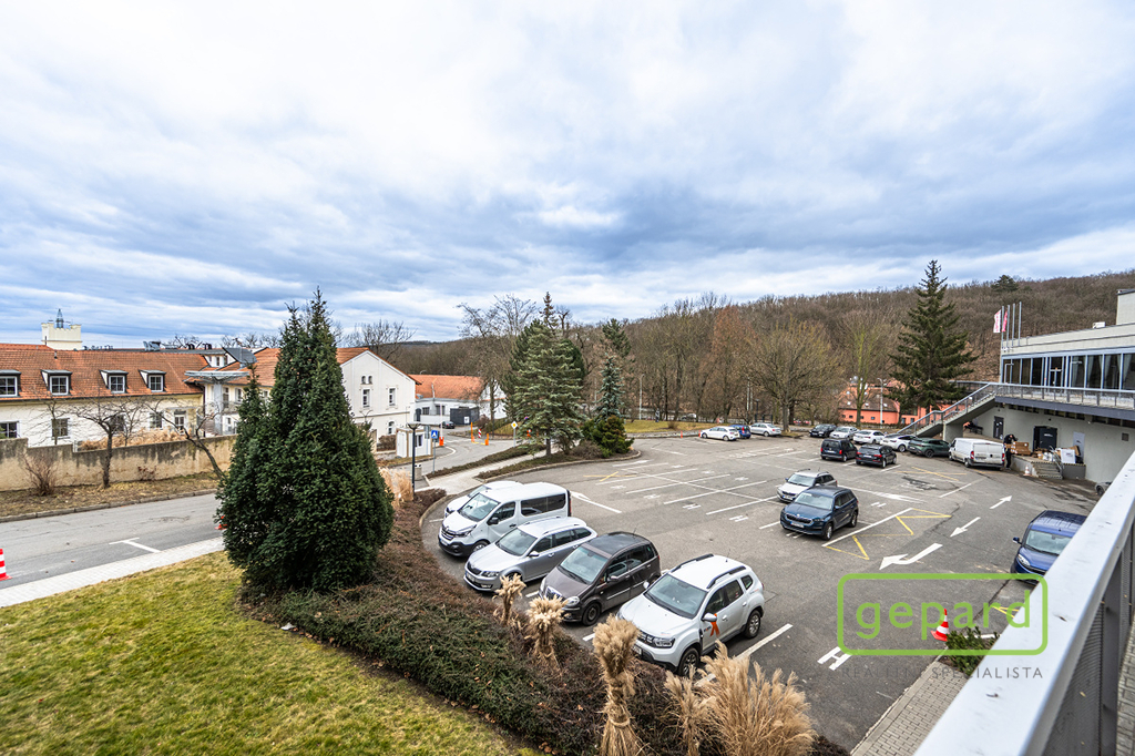 Nabízený prostor o rozloze 97,50 m2 zaujímá část 2. nadzemního podlaží jedné z hlavních budov komplexu. Dispozice je uvedena v přiloženém půdorysu (plocha B). Vybavení je znázorněno na fotografiích. Nájemce může využívat společné prostory: zasedací místnost (23,20 m2), kuchyňku (5,70 m2), toalety (34,90 m2). Poplatek za využívání společných prostor činí 6.408,- Kč. Dále je možné pronajmout sklady (2x4,3 m2 a 1x5,70 m2) za stejnou cenu na m2 jako kanceláře a parkovací stání za poplatek 2.500,- Kč měsíčně za osobní vozidlo. Recepce je v provozu 24 hodin. V komplexu je možné využít konferenční sál (kapacita až 150 míst) a služby restaurace na snídaně a obědy (kapacita až 114 míst) a také služby hotelu.