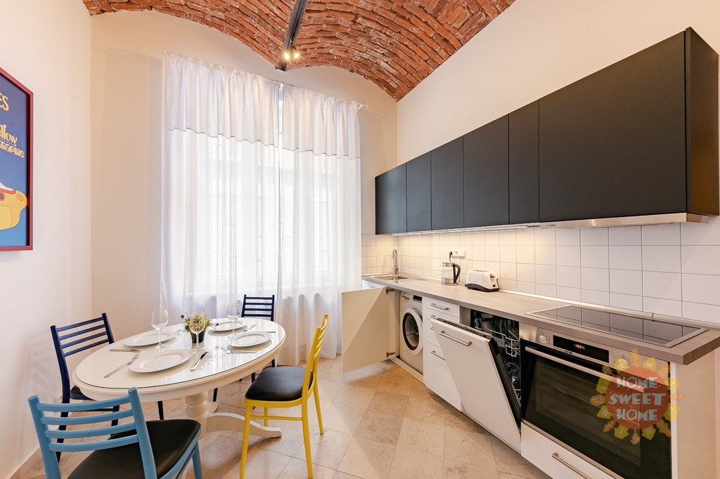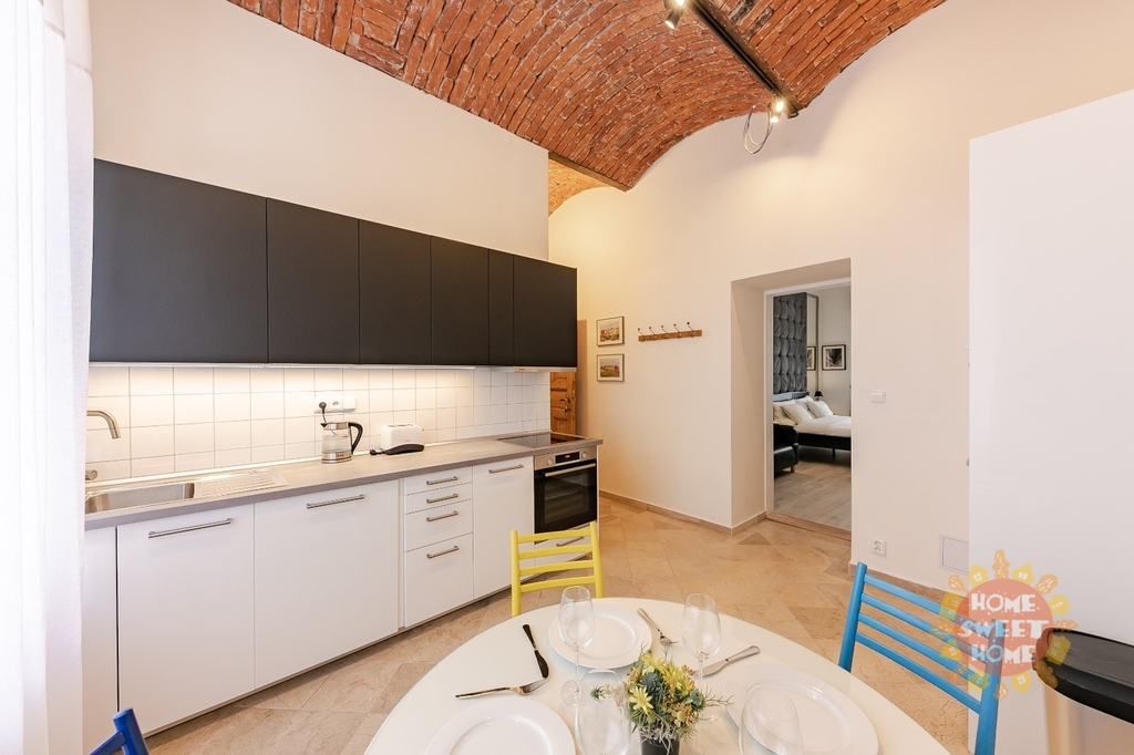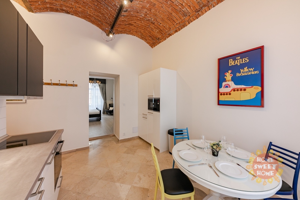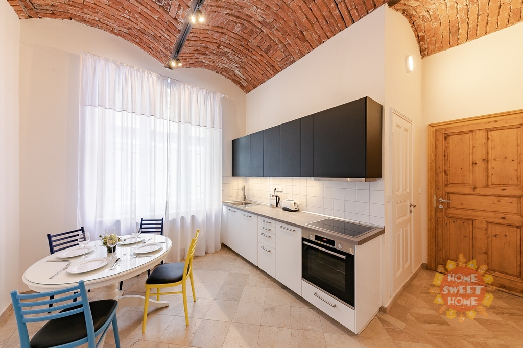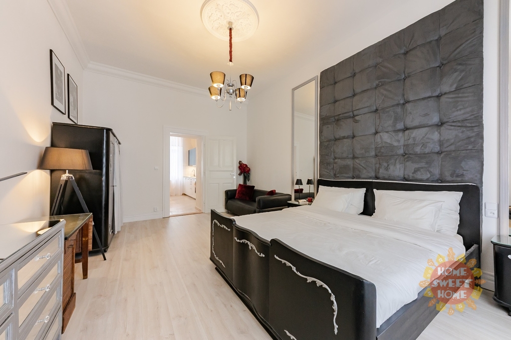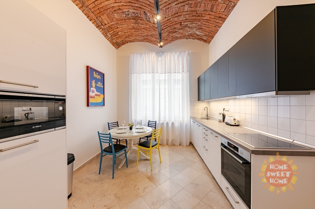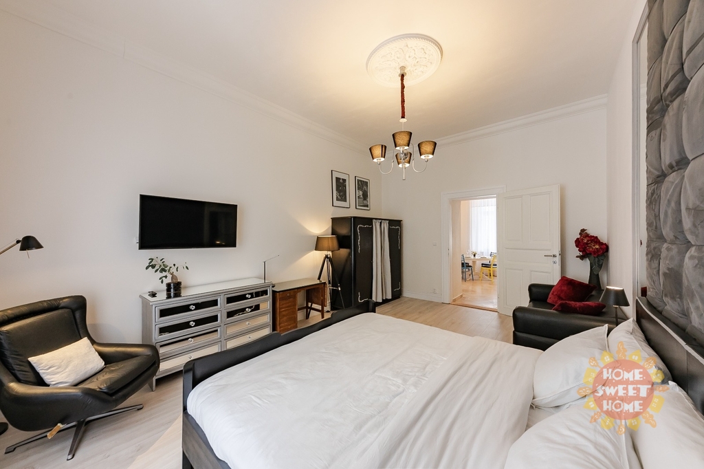 Byt je vybaven kvalitními spotřebiči: lednicí, troubou, mikrovlnnou troubou, myčkou nádobí, pračkou a sklokeramickou varnou deskou. Součástí je kompletní sada kuchyňského náčiní. Velký pokoj (ložnice + obývací část) je vybaven odhlučněnou stěnou, velkou designovou manželskou postelí se dvěma nočními stolky, velkou smart TV, křeslem s lampou na čtení, pracovním stolem se židlí, velkou skříní, pohodlnou pohovkou, konferenčním stolkem a velkým oknem s dostatkem denního světla.