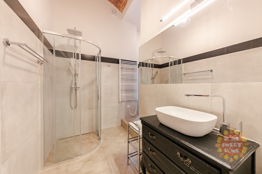 Koupelna se sprchovým koutem nabízí luxusní sprchu, úložnou skříňku, umyvadlo, zásuvky, toaletu a velké zrcadlo.