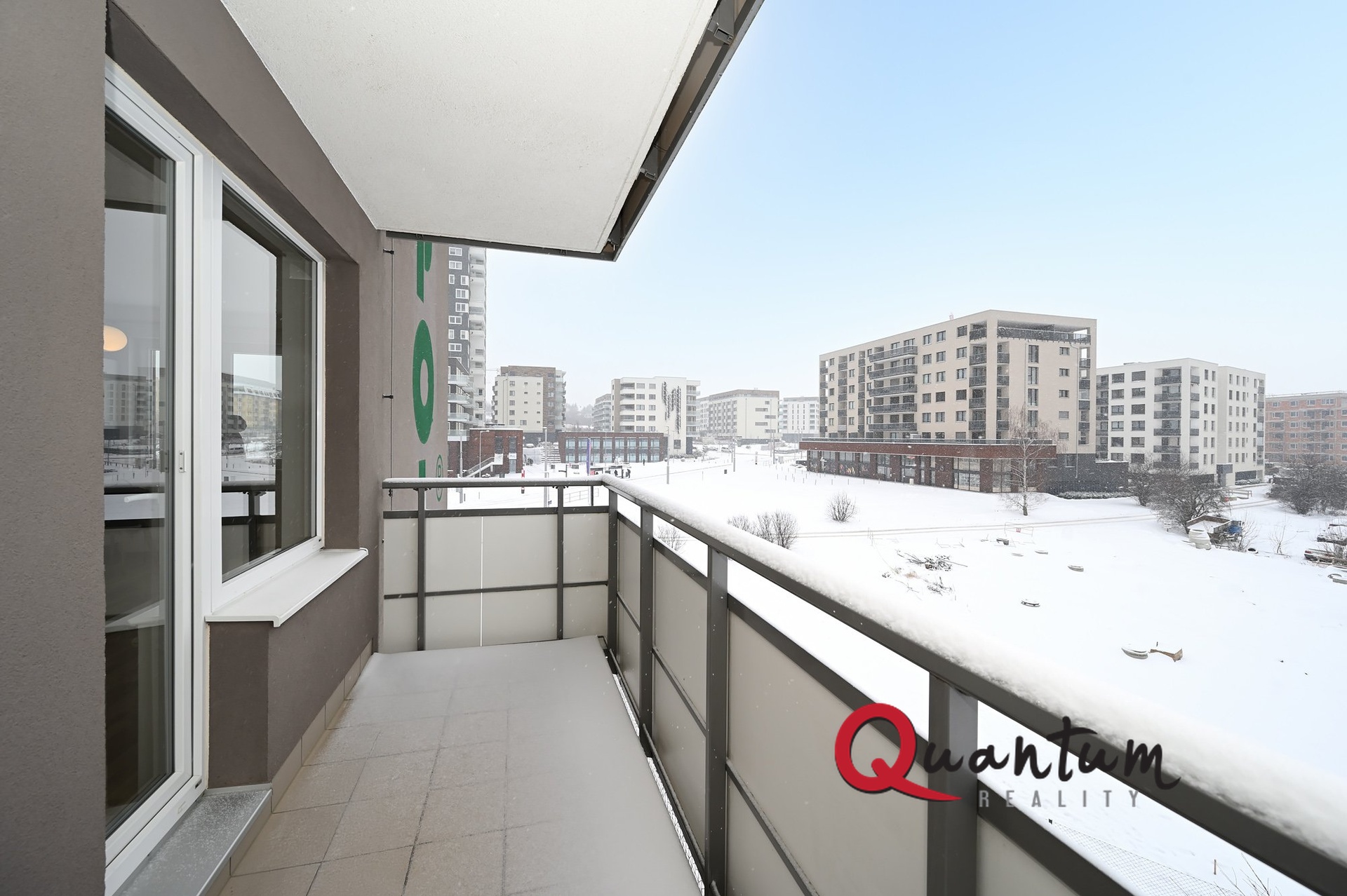 Byt se nabízí nezařízený a jeho dispozice je velmi praktická. Tvoří jej obývací pokoj s kuchyňskou linkou vybavenou spotřebiči: myčkou nádobí, sklokeramickou varnou deskou, elektrickou troubou, mikrovlnnou troubou a lednicí s mrazákem. V obývacím pokoji se nachází vstup na balkon. Ložnice vybavena šatní skříní. Koupelna se sprchovým koutem a toaletou. Prostorná vstupní chodba s botníkem a skříněmi.