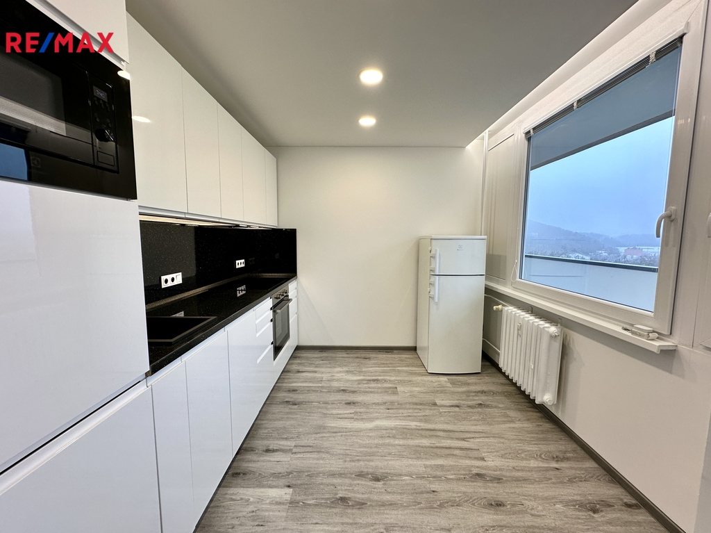 Kuchyň nabízí dostatek prostoru pro jídelní stůl až pro 4 osoby a je prosvětlená okny v celé šíři.