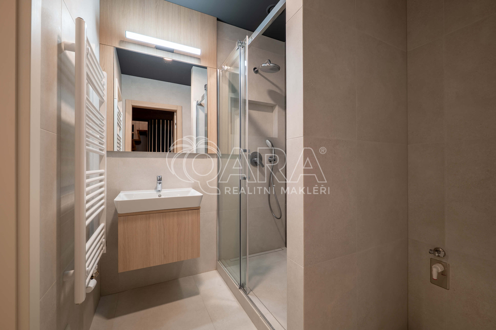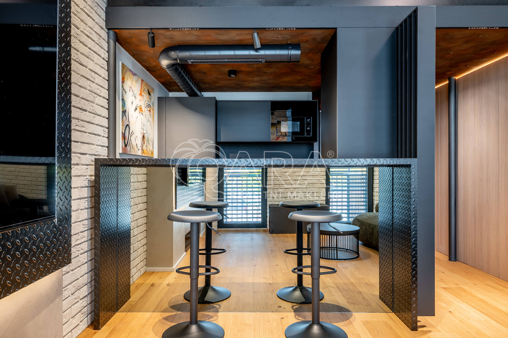 Nadstandardní byt s důrazem na detail nabízí celkovou podlahovou plochu 43 m² + spací patro o velikosti 10 m² (s výškou stropu 130 cm), balkon 3 m² a sklep 3 m². Nachází se v moderním projektu v srdci jedné z nejžádanějších pražských čtvrtí.