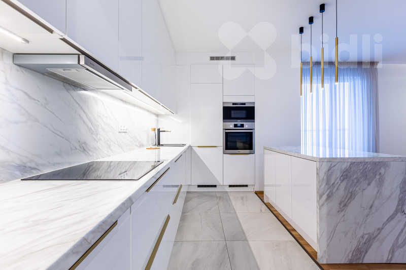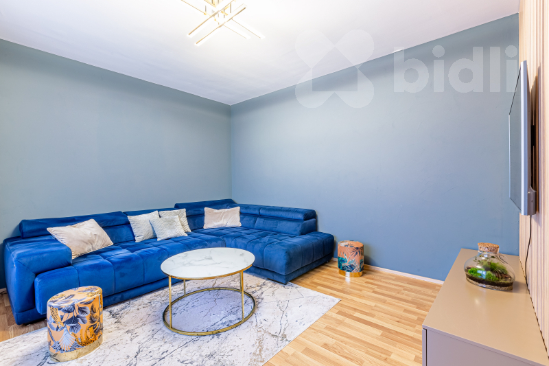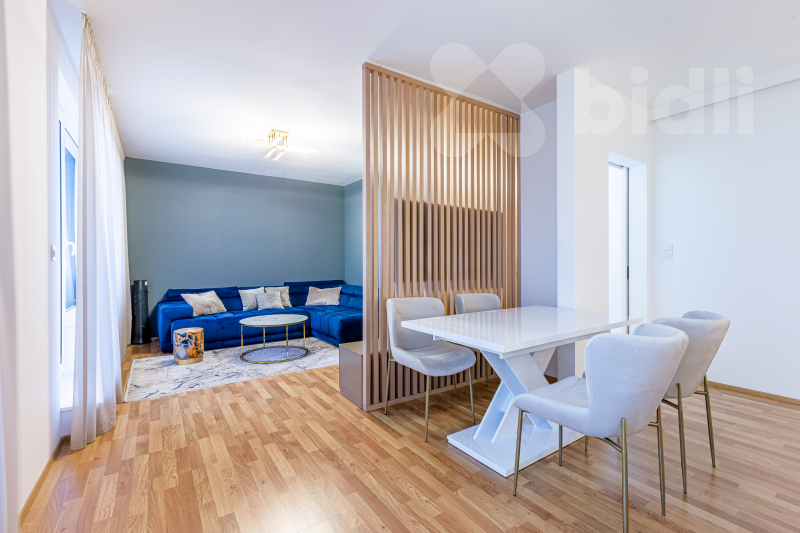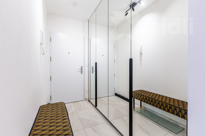 Dispozičně nabízí světlý obývací pokoj s plně vybavenou kuchyňskou linkou na míru a přímým vstupem na terasu, ložnici s dostatkem úložného prostoru a vstupem na balkón, elegantní koupelnu a vstupní chodbu. Byt je kompletně vybaven kvalitním nábytkem a značkovými spotřebiči.