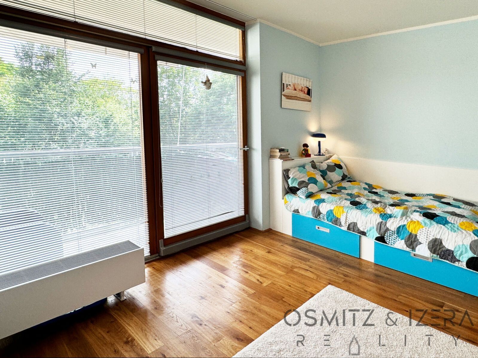 Dva pokoje fungující jako ložnice s dostatkem úložného prostoru a dětský pokoj poskytují klidné bezpečné prostředí. Elegantně zařízená koupelna se sprchovým koutem a pračkou a samostatným WC dodává bytu dávku exkluzivity. Vstup na balkony je přes francouzská dřevěná eurookna z každého pokoje.