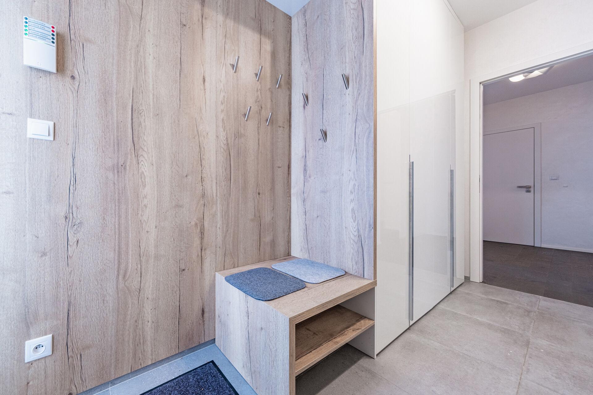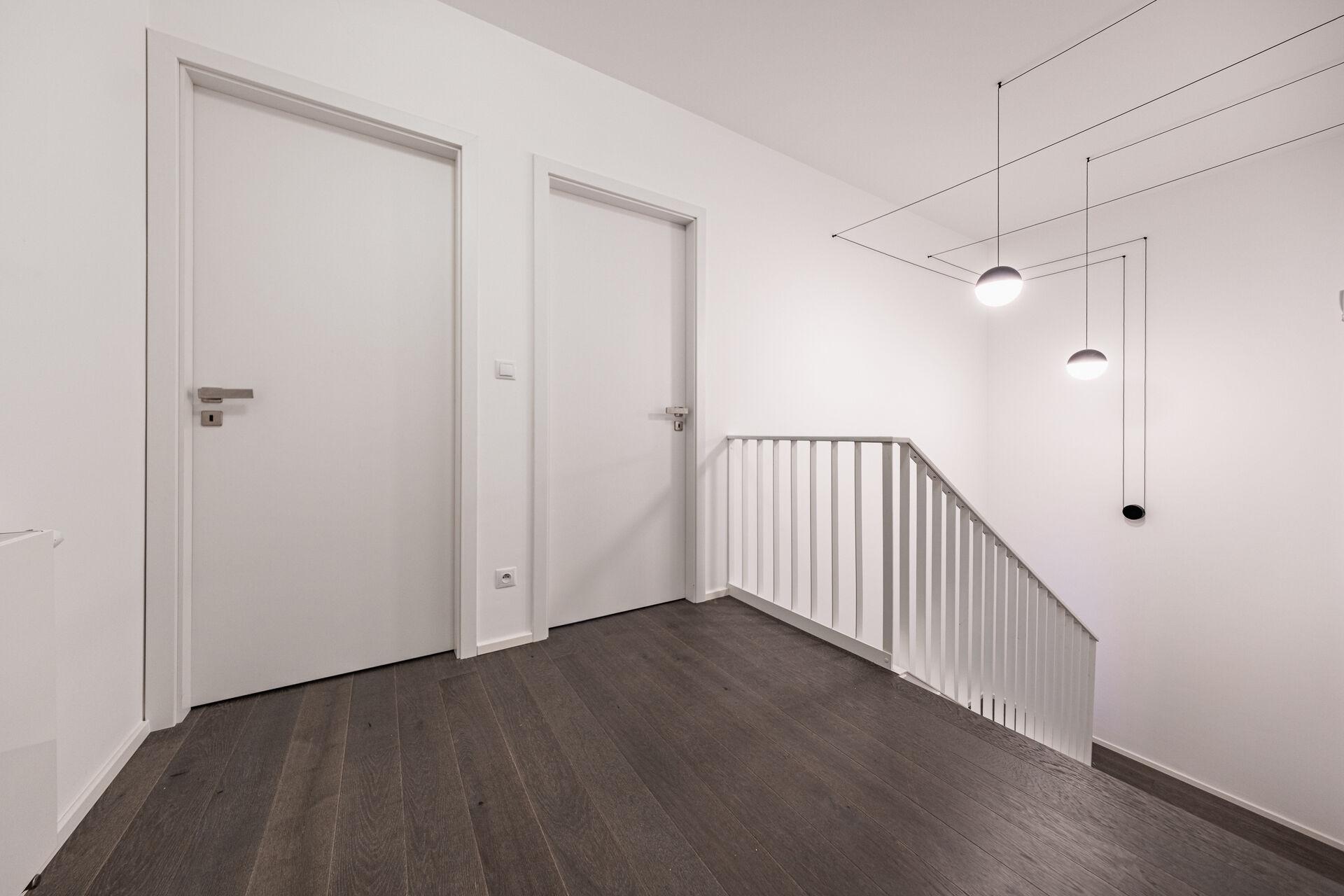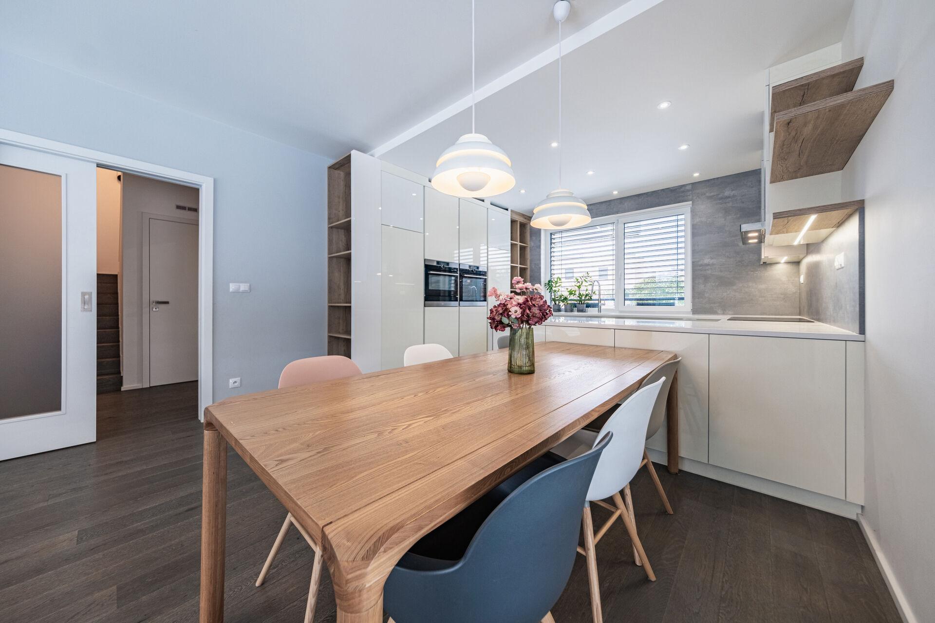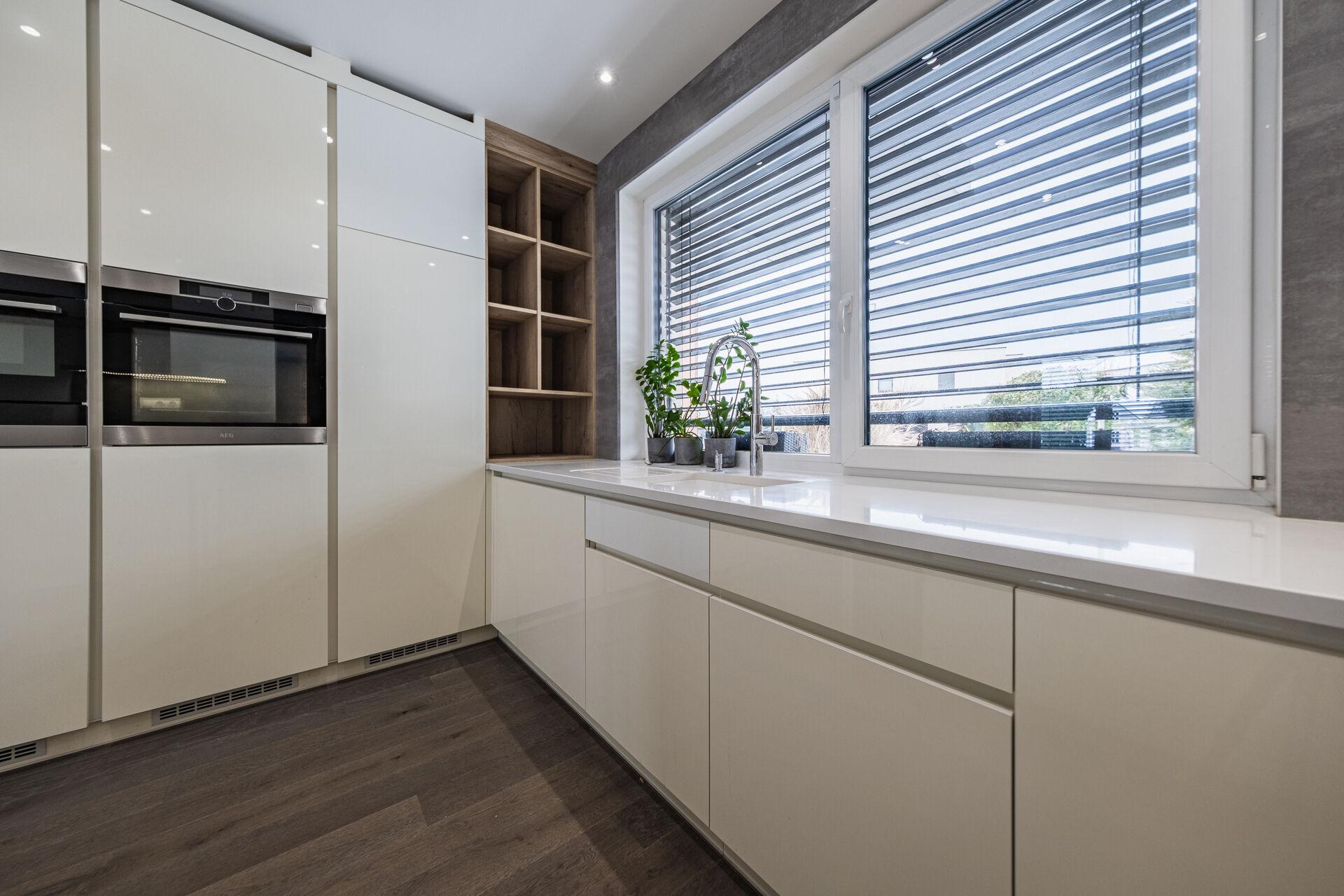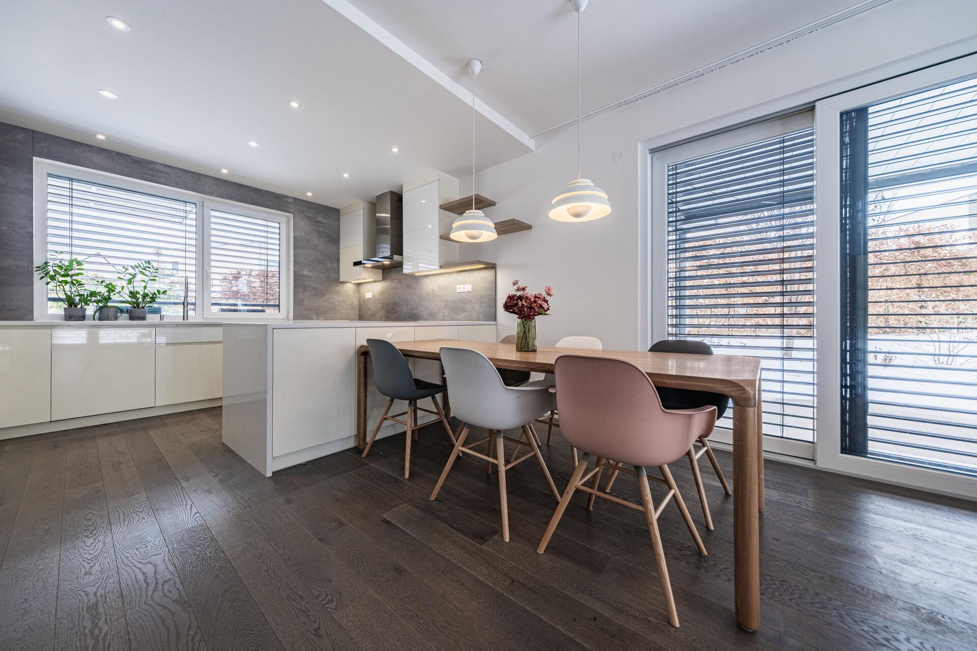 Interiér domu je kompletně řešen na míru truhlářem – od vestavěných skříní, přes elegantní úložné prostory v každém koutě domu až po luxusní kuchyňskou linku s moderními technologiemi a vinotékou, která potěší i náročné milovníky vaření.