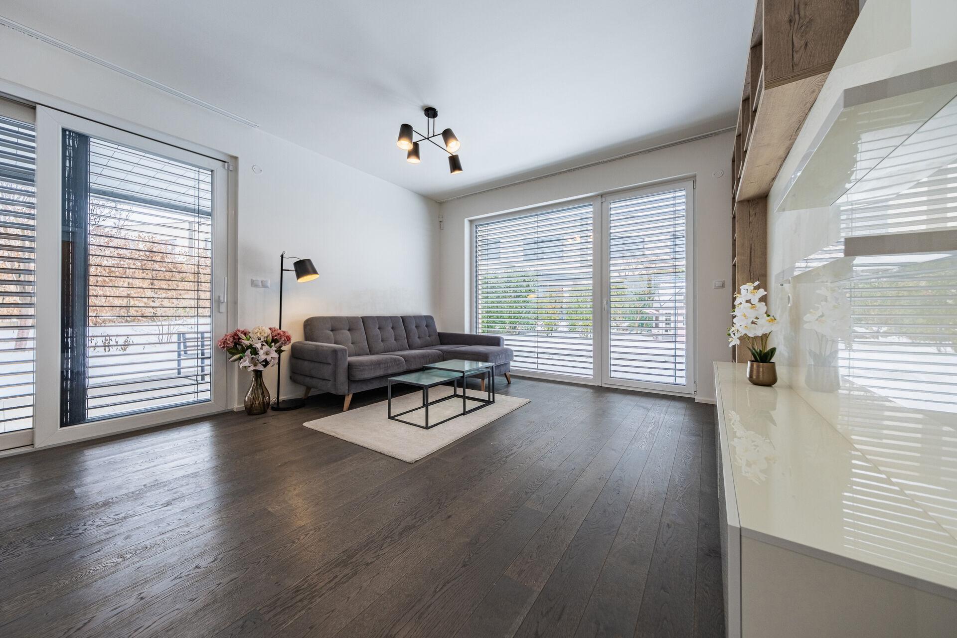 Z obývacího pokoje je přímý vstup na terasu s bioklimatickou pergolou, vybavenou screenovými roletami na dálkové ovládání.