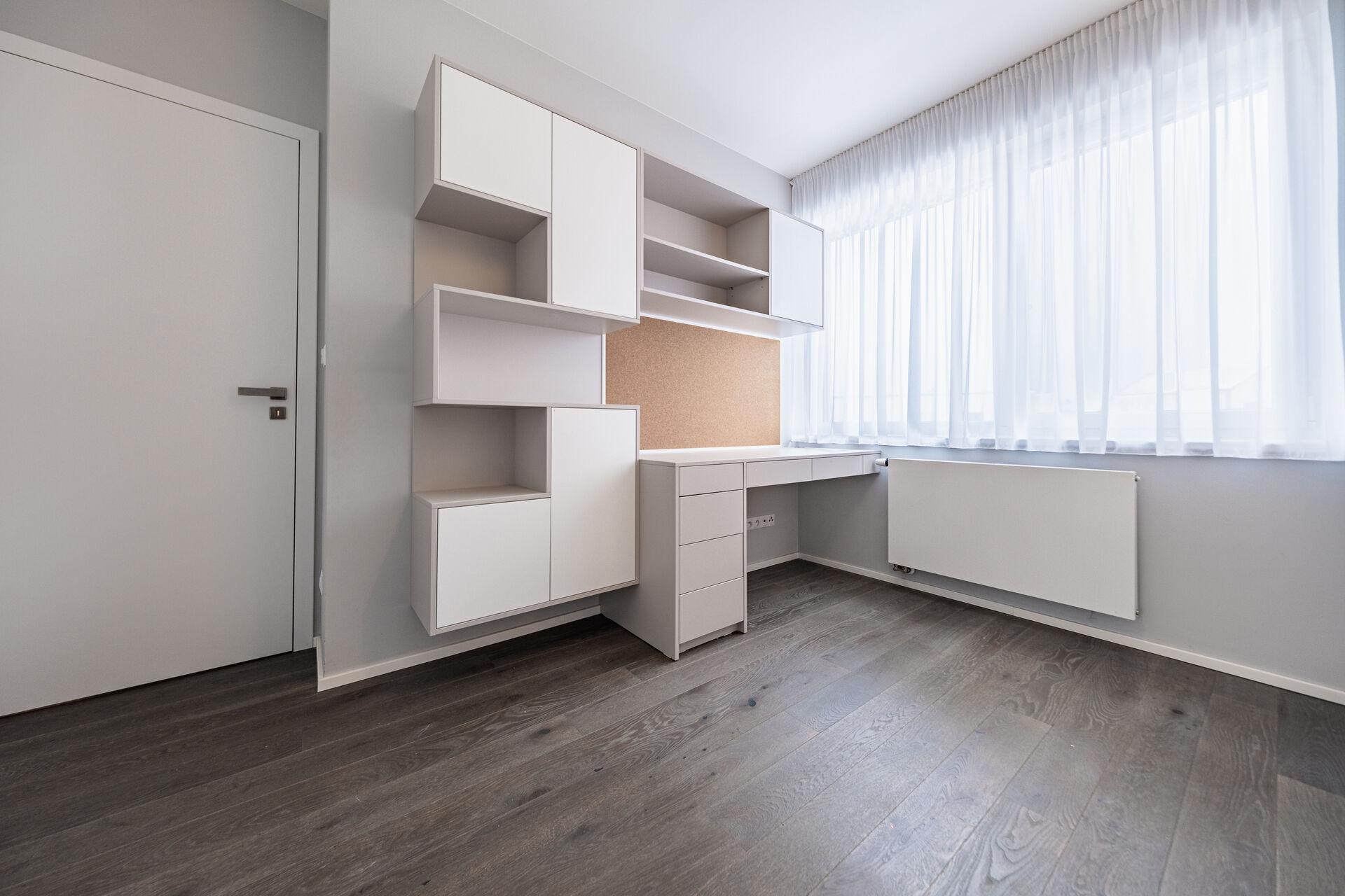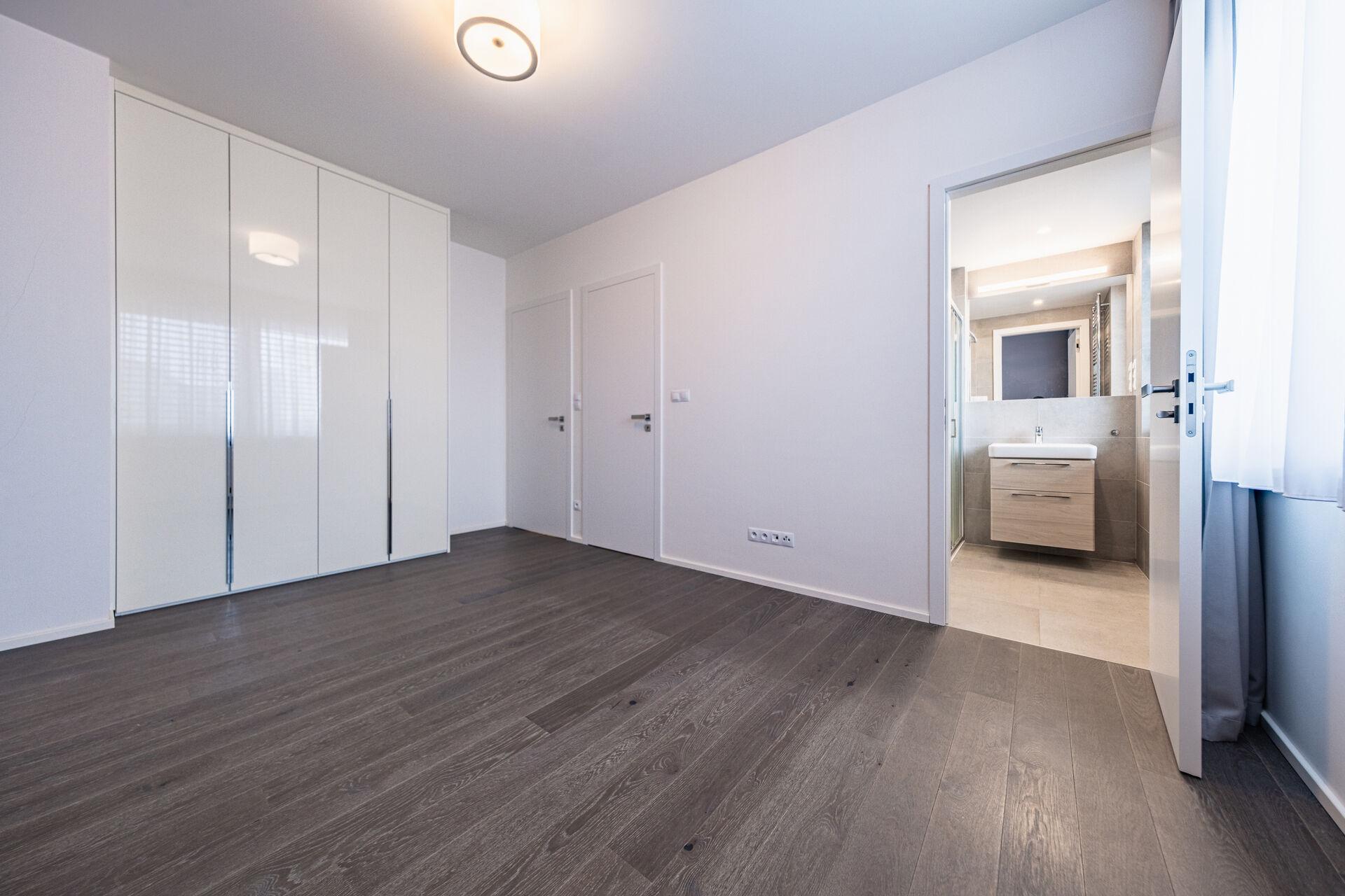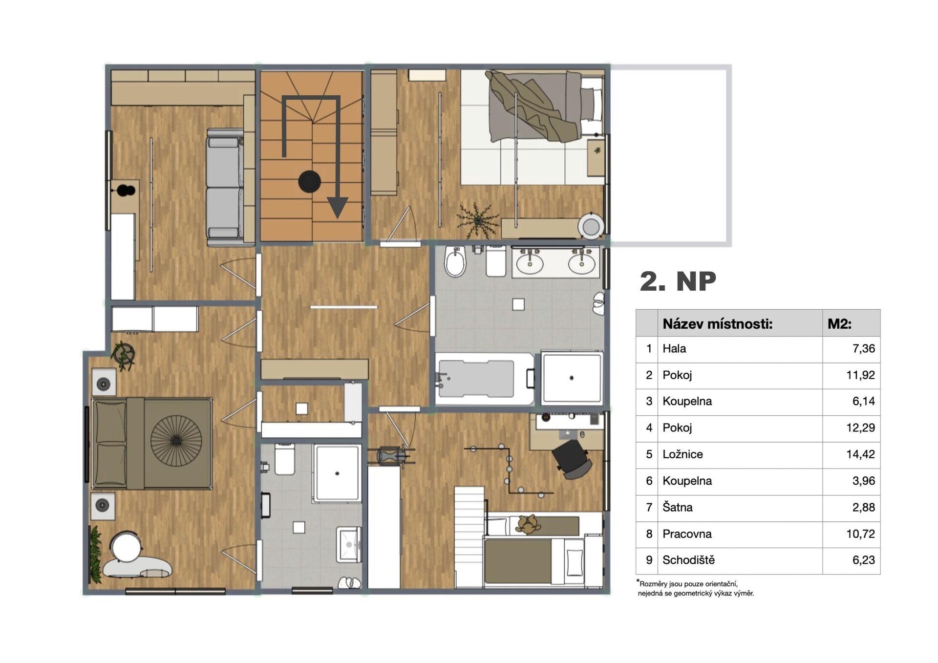 ložnici s vlastní koupelnou, sprchovým koutem a šatnou, dva dětské pokoje / pracovny, další koupelnu s vanou i sprchovým koutem, samostatnou pracovnu a centrální chodbu.