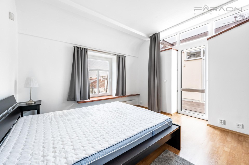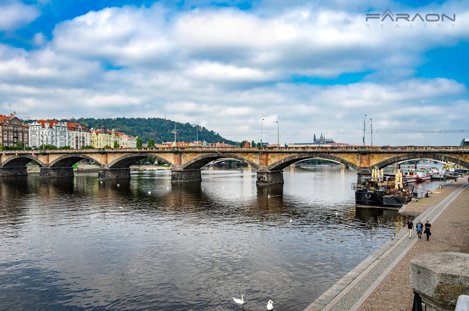 K pronájmu luxusní dvoupatrový byt 5+kk, 250 m2 s terasou a zimní zahradou, s nádherným výhledem na řeku Vltavu, Pražský Hrad a Petřín, v 6. a 7. patře kompletně zrekonstruované historické secesní budovy s výtahem v blízkosti nábřeží, pár minut od Palackého náměstí a Karlova náměstí, v ulici Dřevná, Nové Město, Praha 2.