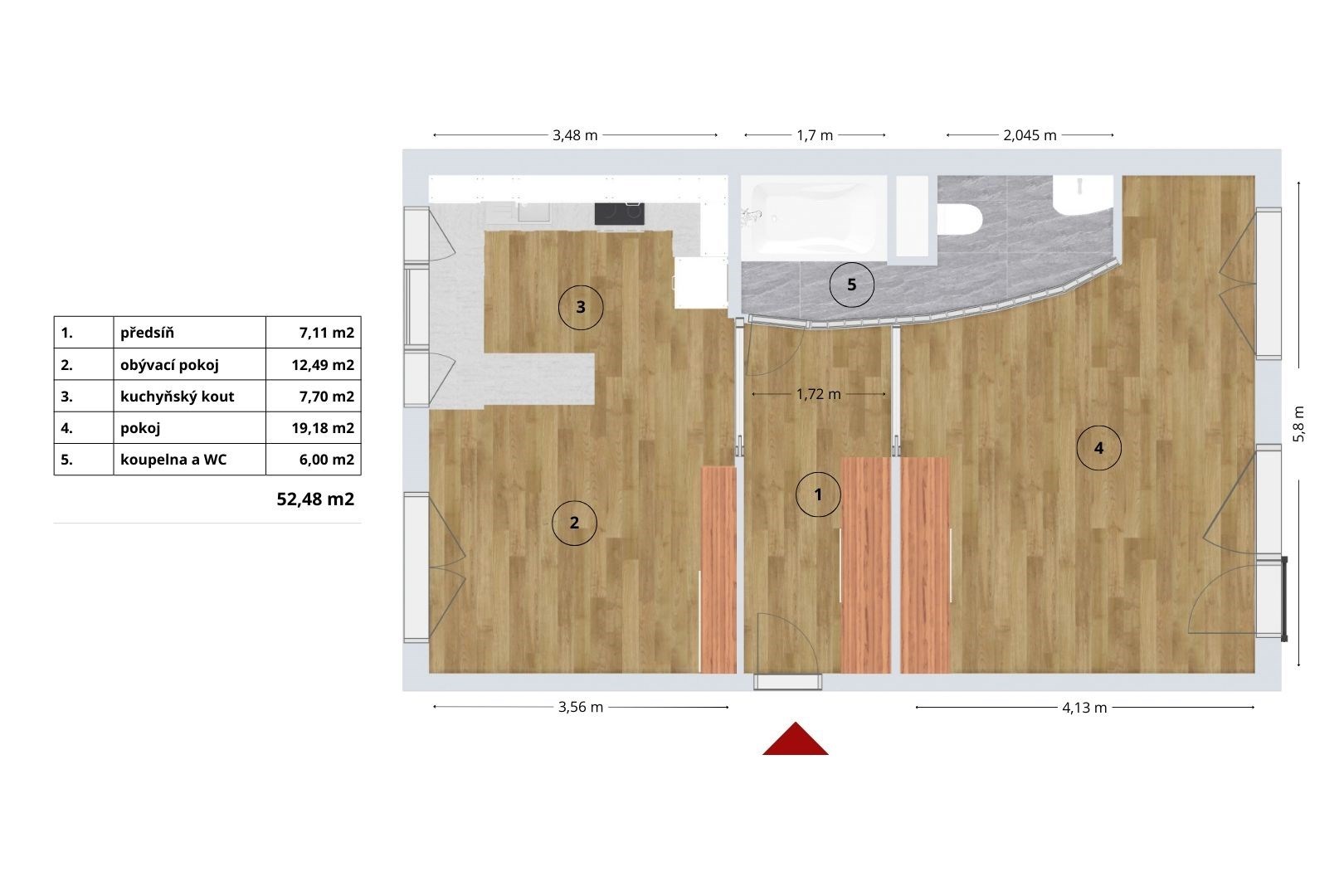 | Dispozice/podlahová plocha: | 2+kk/53 m² |