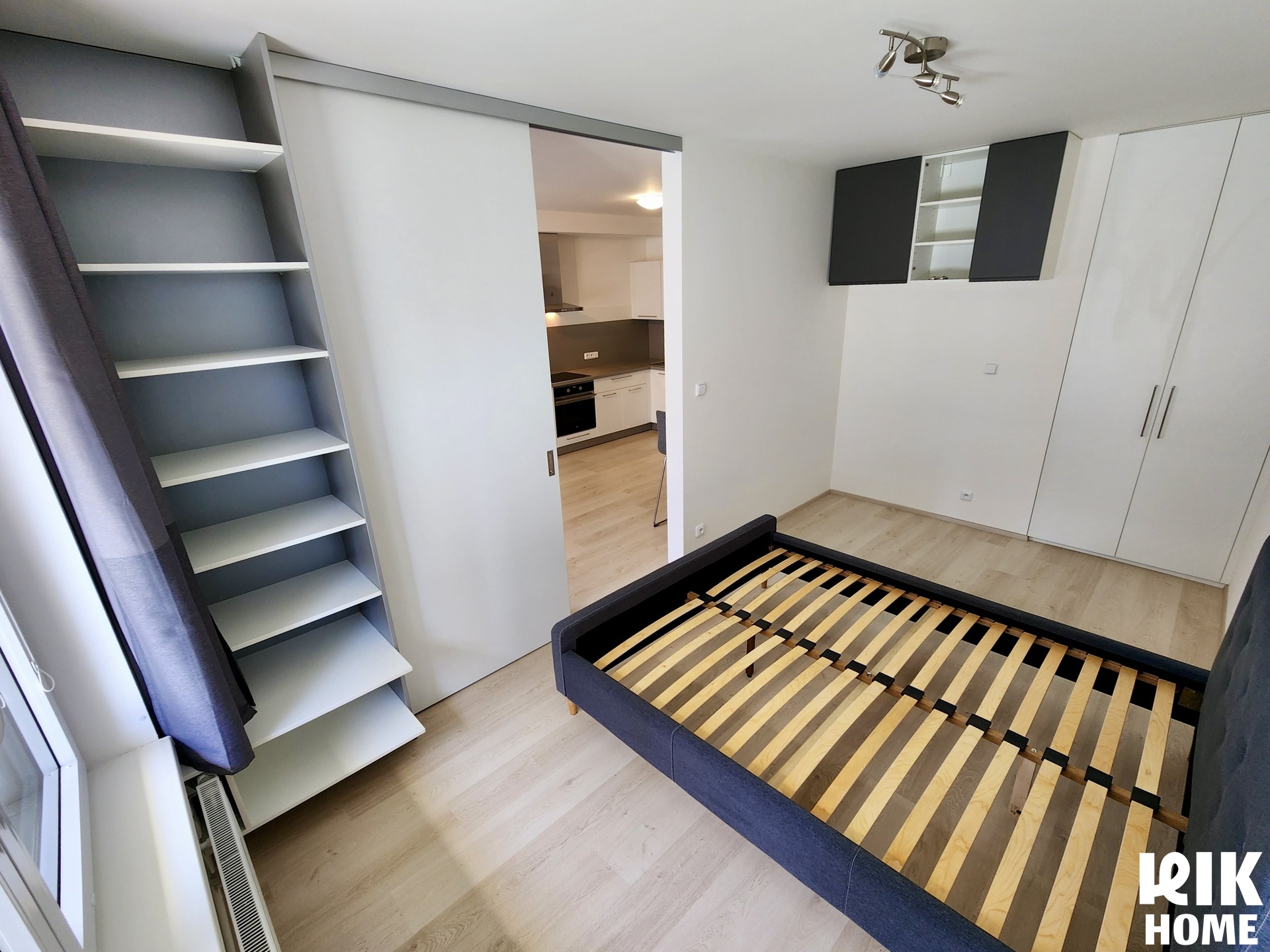 Ložnice je oddělena vestavnou policovou stěnou s posuvnými dveřmi. Najdete zde polstrovanou manželskou postel (160x200 cm) s lamelami, vysokou vestavnou šatní skříň s policemi a šatní tyčí a další závěsné skříňky.