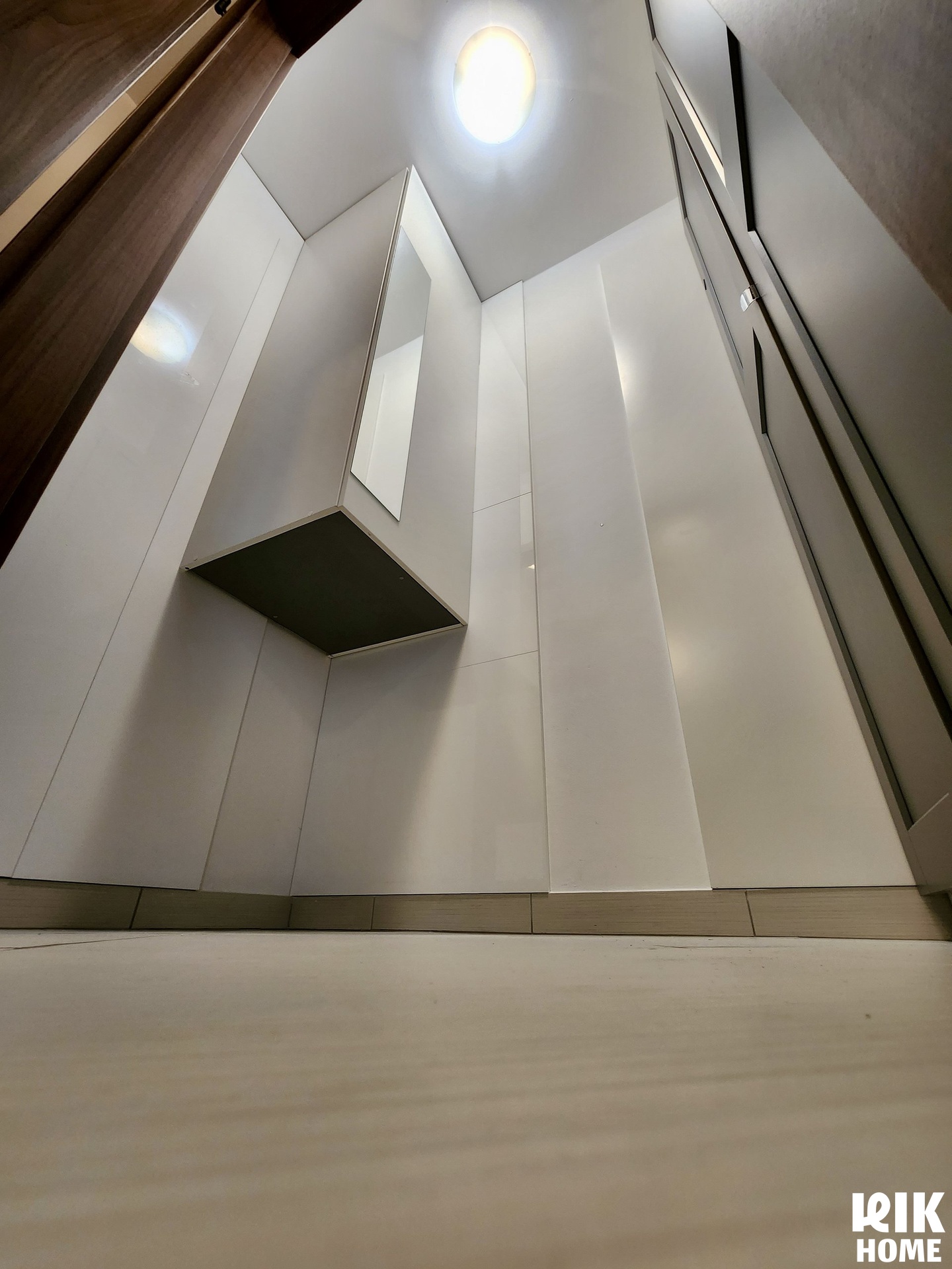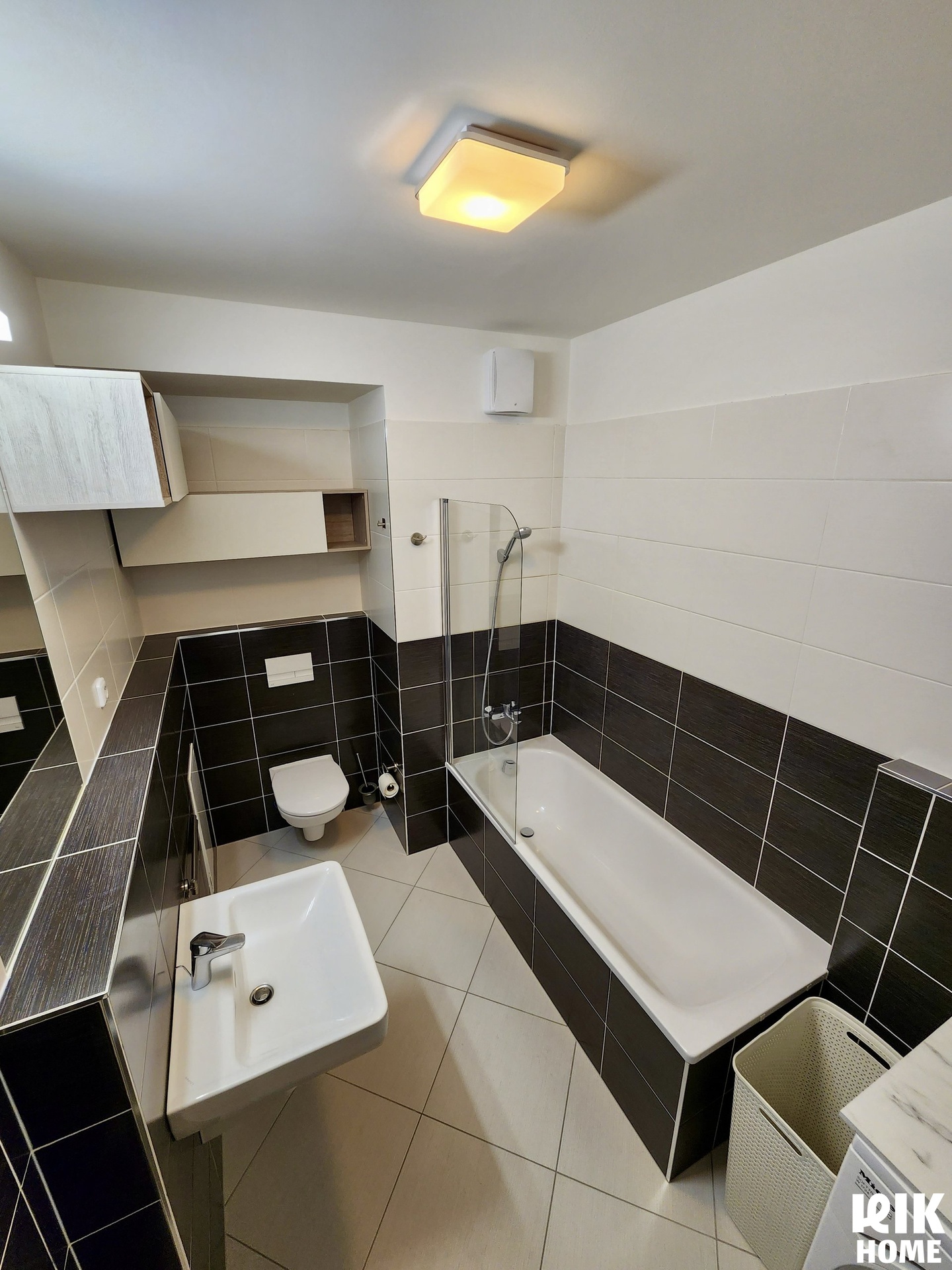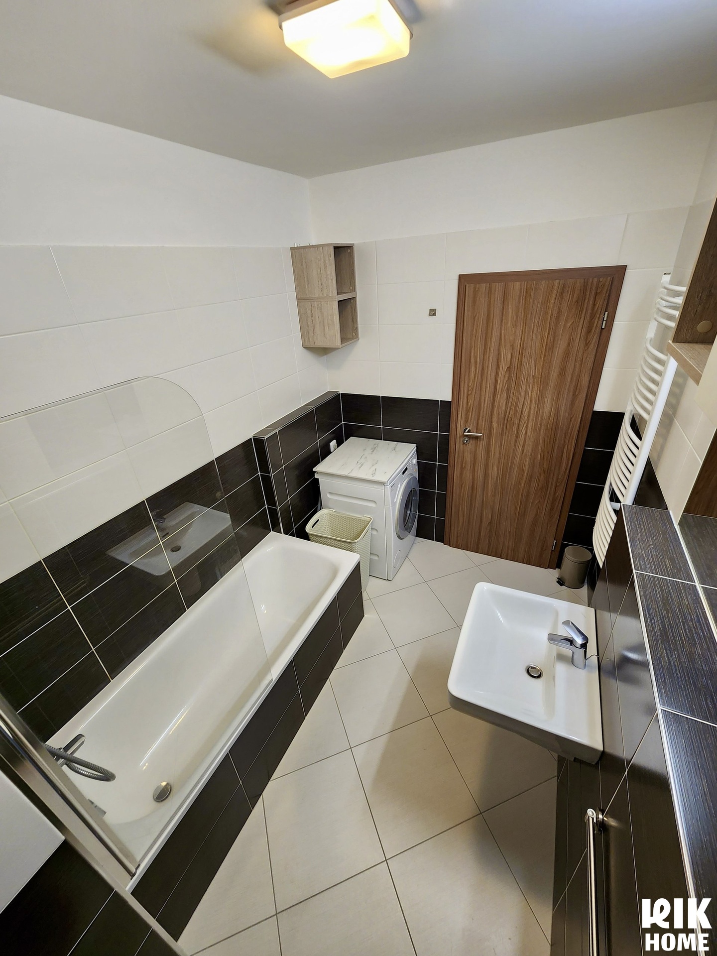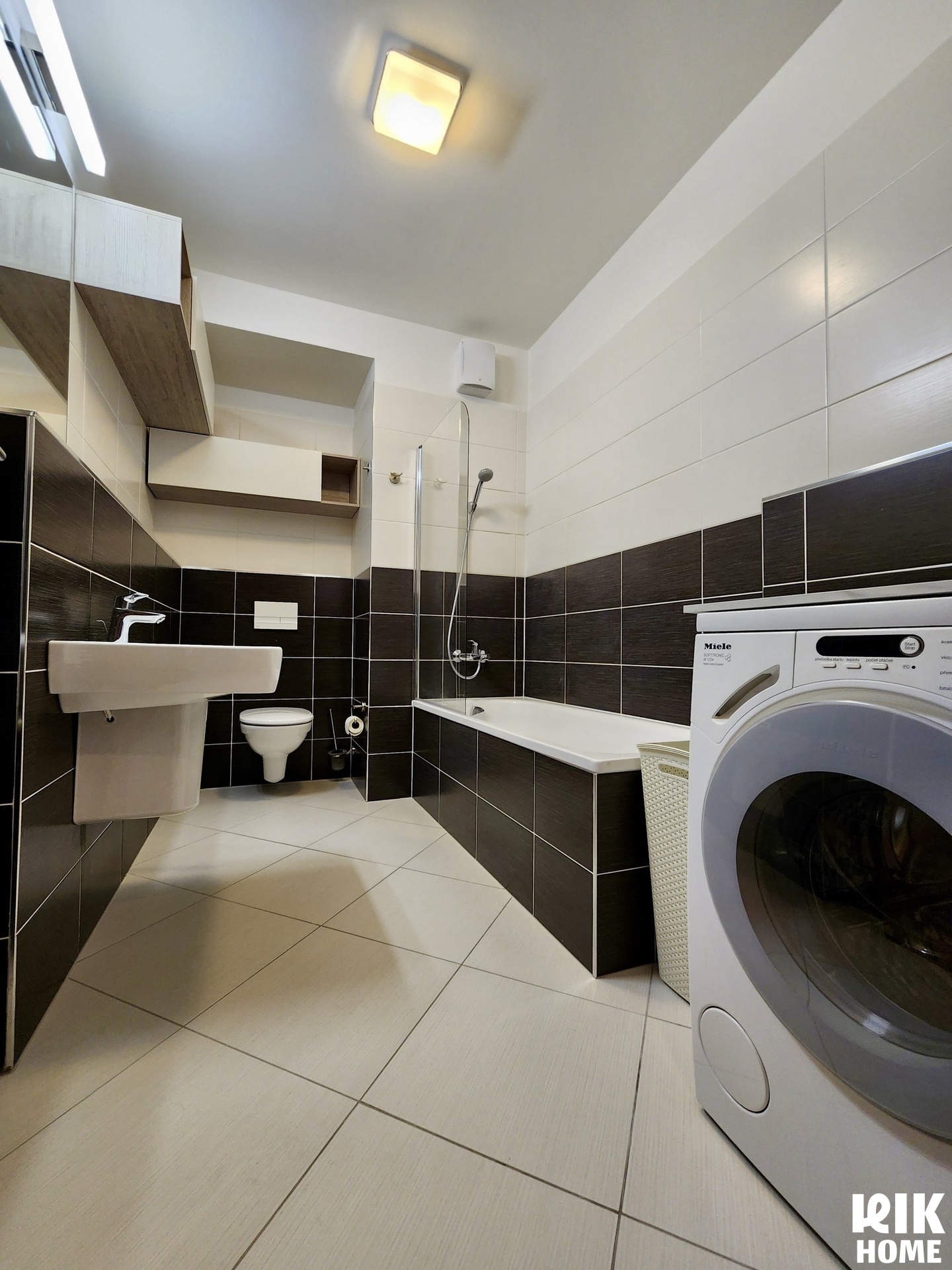 Koupelna disponuje vanou s transparentní skleněnou zástěnou pro sprchování, umyvadlem se zrcadlem, závěsným WC a pračkou. Nad pračkou a toaletou jsou umístěny praktické závěsné skříňky.