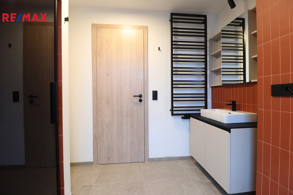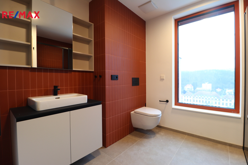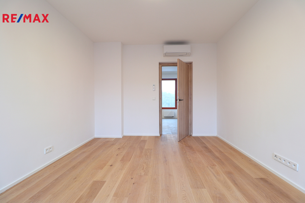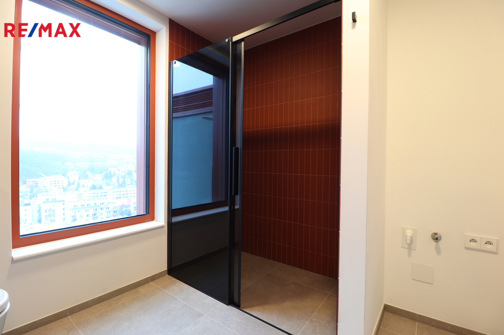 Dispozice bytu (5.1.) zahrnuje vstupní chodbu, designovou koupelnu se sprchovým koutem, umyvadlem s koupelnovou skříňkou, WC a přípravou na pračku i sušičku. Z chodby se vstupuje do světlé kuchyně s hezkým výhledem na Prahu, přičemž disponuje moderní kuchyňskou linkou se spotřebiči - lednicí s mrazákem, troubou, indukční varnou deskou, myčkou, dřezem a digestoří. Samostatná ložnice je orientována na jižní stranu, což zajišťuje dostatek denního světla a příjemnou atmosféru. V kuchyni i ložnici je instalována klimatizace a elektrické předokenní rolety, které zvyšují komfort bydlení po celý rok. Internetové připojení je řešeno přes O2 / CETIN, v bytě jsou připravené datové zásuvky. Okna jsou trojskla, tudíž zaručují velmi dobrou izolaci. Topení v ložnici bude osazené v nejbližších dnech.